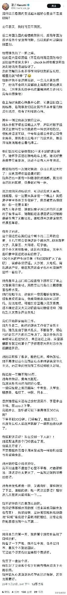 很多人以为跑到邻国日本就好像跑到了天堂,可以享受日本发达国家的福利。但是看到一位网友回到上海,到堂妹家待了几天,把大家都整的不会了,她严重的怀疑自己当初移民到日本是不是真的错了,因为通过这位网友的叙述,她跟她堂妹的生活简直就是天差地别。虽然她在日本看起来高大上,但是,生活质量远远不如她堂妹的生活质量。日本真的不是适合每个人的。