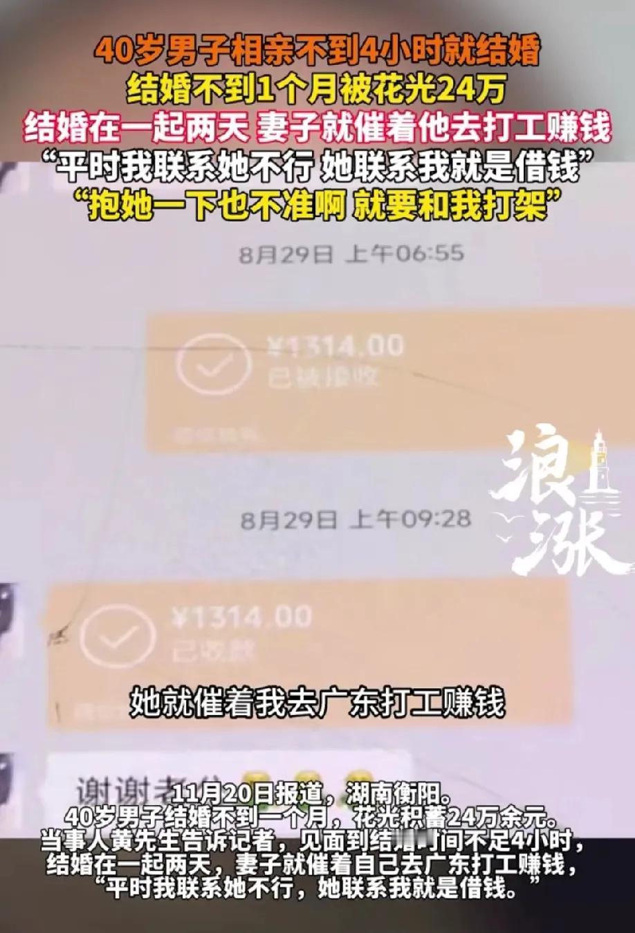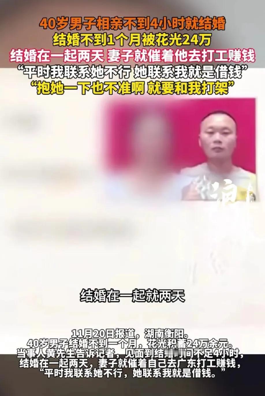 湖南衡阳,40岁男子相亲时遇到心仪的女子,两人相识不到4小时就领证结婚。本以为找到了爱情的幸福,不成想,结婚刚两天,妻子就催着他去广州打工赚钱,平时也不允许他主动联系她,妻子每次打电话开口就是要钱。结婚不到一个月,男子花光了24万积蓄,还没抱过妻子一下。 网友评论: 能活40岁,还有24万已经是个奇迹了! 至少结婚前要了解考察对方性格脾气人品三观,为人处世家庭背景等等,至少一年!4小时不是开玩笑吧[恐惧] 黄先生啊黄先生,你是真黄了,咋这么天真带无邪呢[笑哭][笑哭][笑哭] 头脑那么简单怎么赚的24万 40岁智商还是儿童,这么明显的骗子,居然能骗走24万 来源:辨案析灋