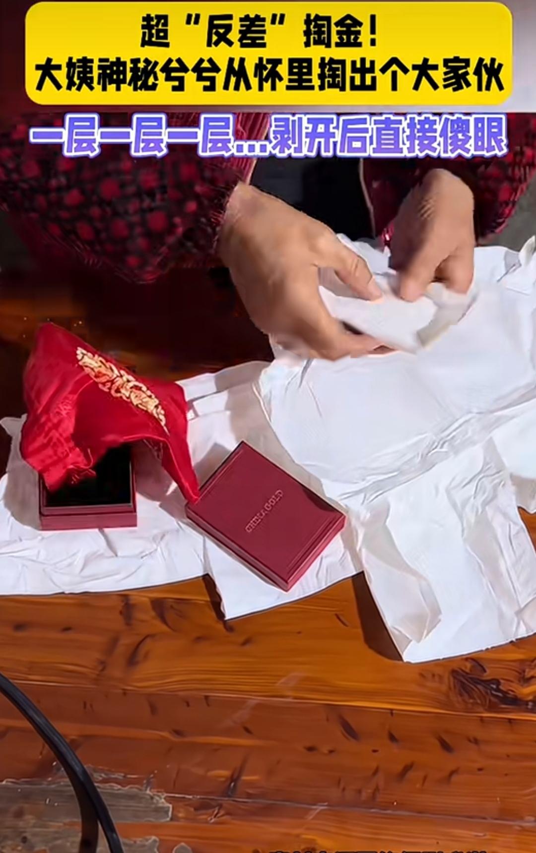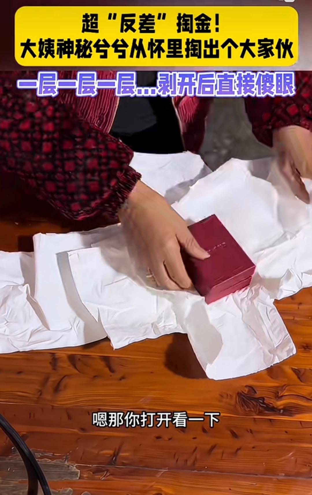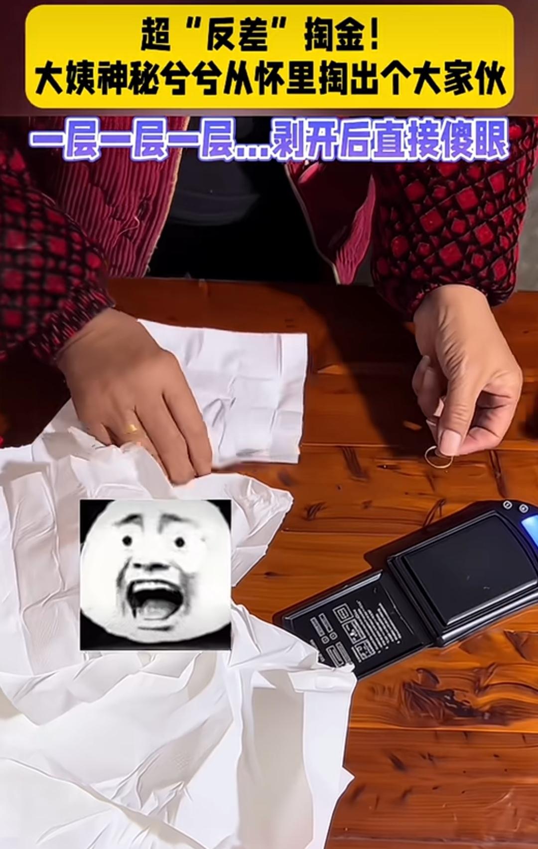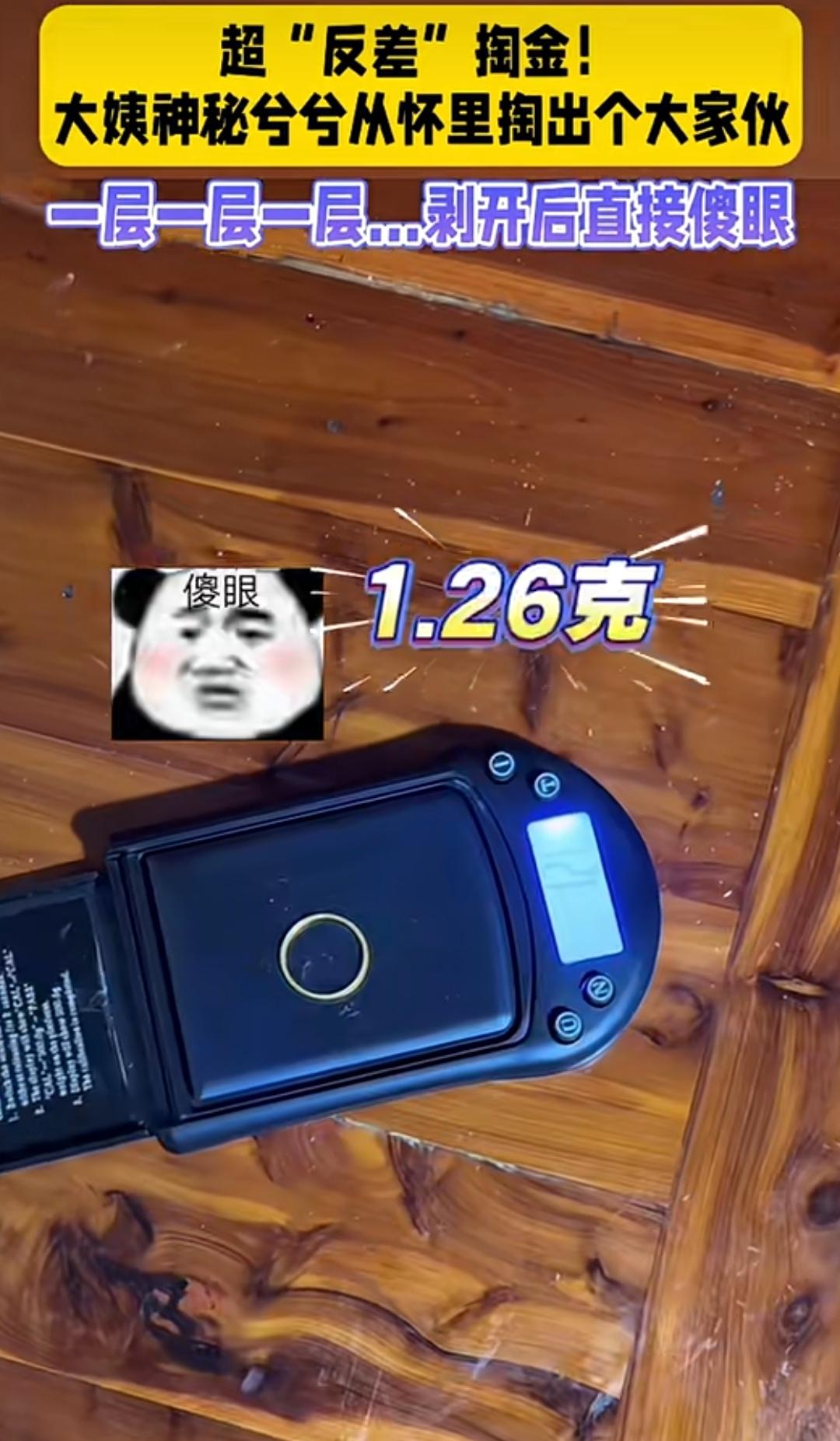 阿姨掏东西像拆盲盒,层层剥开藏惊喜,最后亮瞎眼! 阿姨讲现在金子好贵,她神神秘秘往怀里一揣,那郑重其事的样子,搞得我满心好奇,还以为是啥大件宝贝。只见她慢悠悠掏出来个鼓鼓囊囊的包裹,一层裹着一层,拆了好多层还没见底,越拆越期待。 拆到最后一层,突然露出点金光,定睛一看居然是枚金戒指,小巧精致还闪着光。这层层递进的仪式感,比拆快递还上头,又好笑又暖心的,一称1.26克。