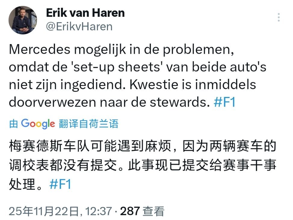 梅赛德斯车队代表赛后要去小黑屋向赛事干事报道,梅赛德斯车队没有提交两台赛车的调教