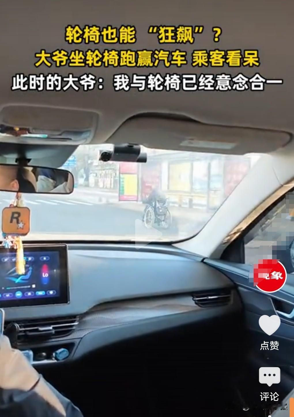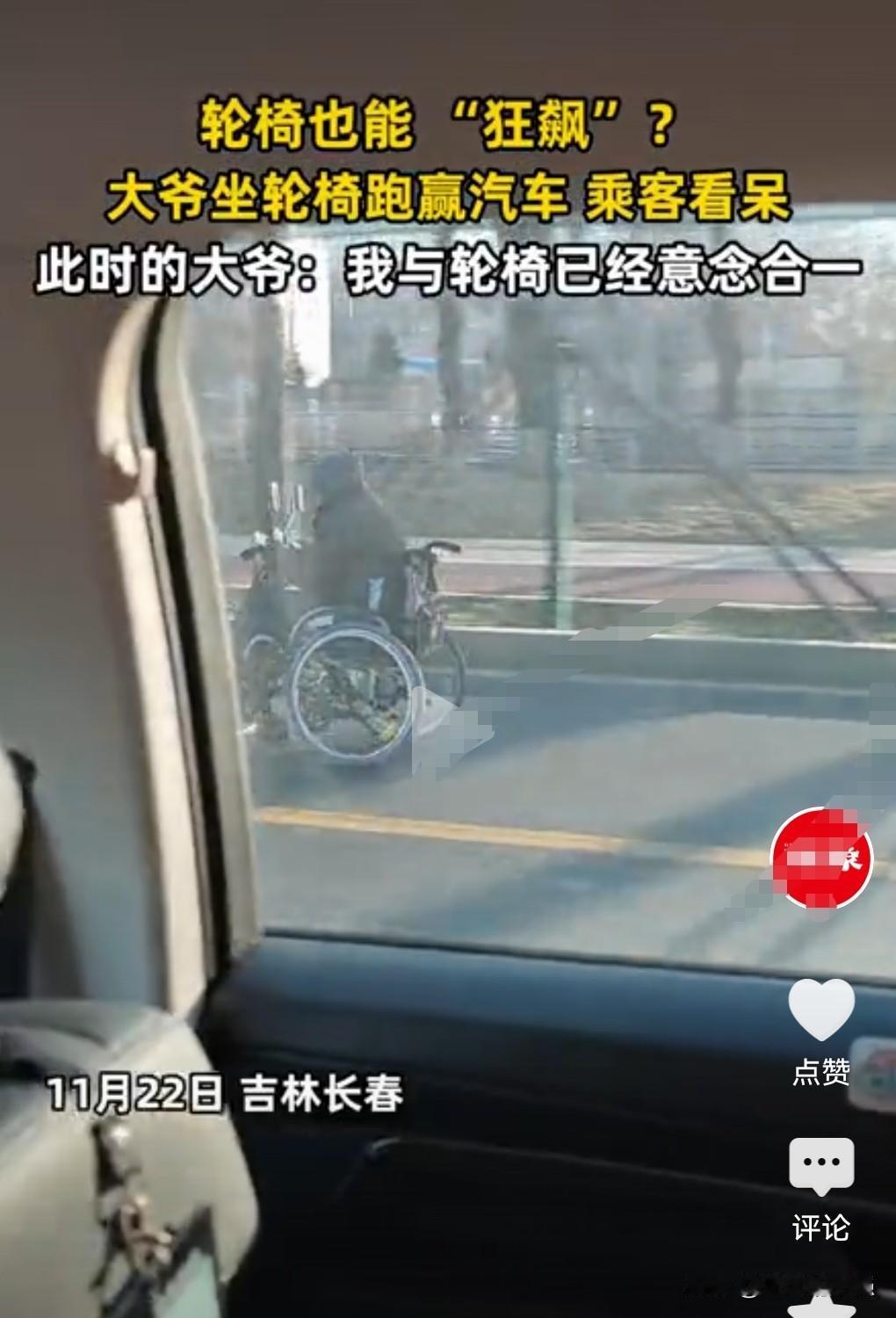 这大爷真是有一颗躁动年轻的心呐,竟然在马路上坐轮椅开这么快。 速度竟然超过了当时的汽车。 当然也不排除汽车是在让他,毕竟是想拍下老人的视频。 不过视频中这轮椅的速度确实挺快的。 有一说一,这还是挺危险的。 如果让交警看到了,肯定要对大爷进行劝阻。