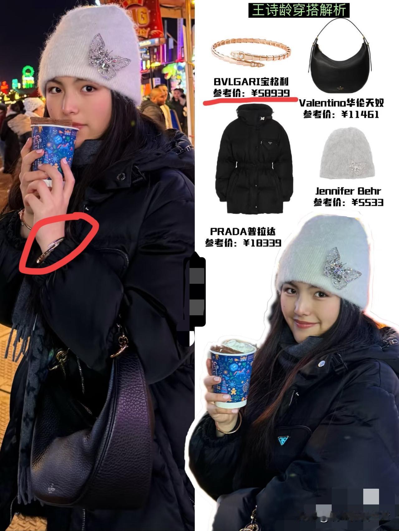 瞧,近6万元的手环!果然王诗龄的日常穿搭,多么优雅精致,影星范儿十足! 冬天里的一杯奶茶,让她把“贵气松驰感”,从电视剧里拉回到现实的异国街头,这一身服饰令人看了好舒服,可爱之中不失俏皮! 王诗龄裹着PRADA黑色收腰羽绒服,手戴宝格丽Serpenti款式饰品,头顶Jennifer Behr的毛绒帽,这一份细节的显贵,虽不张扬但足够吸睛!真是保暖与造型感双向奔赴! 英式教育下的王诗龄,很注重礼仪和外表,气质上已褪去幼时的稚气,当然她留学动态和亮眼的绘画成绩,也令人关注,教育是提升一个人的良好方式,相信她未来美好可期! 祝愿王诗龄学业顺利、更加成功! 对此,您怎么认为的呢?