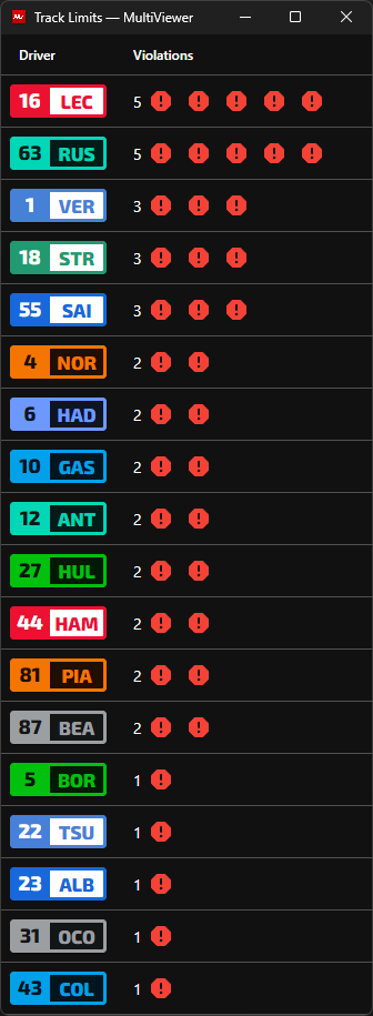 只有阿隆索和劳森没有在今天的排位赛期间超出过任何赛道限制