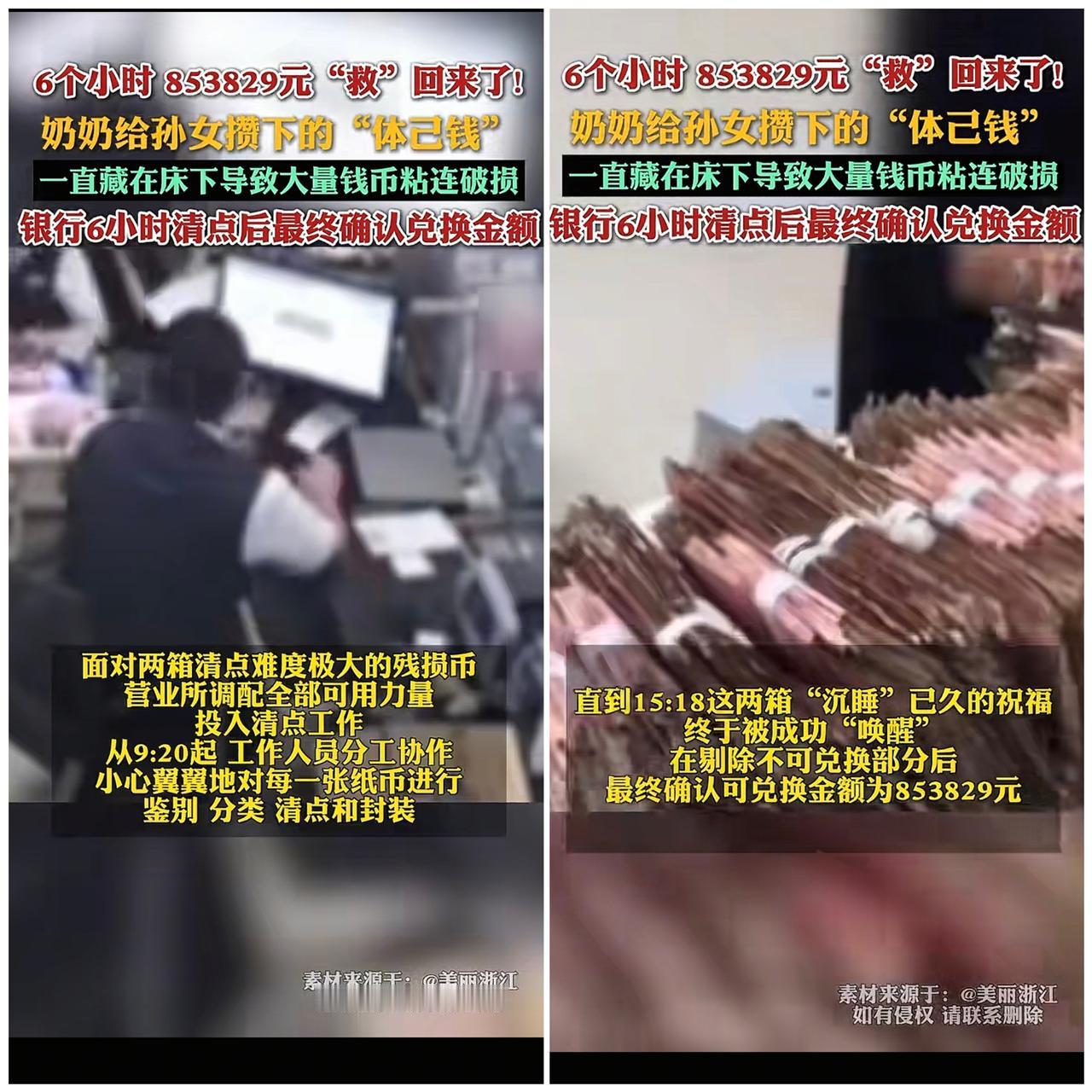 “真的又心疼又庆幸!”江苏海安奶奶藏床底的“嫁妆钱”结成霉砖,银行6小时抢救回85万,这事儿看着暖心,却藏着戳中无数家庭的真相。 老一辈的“存钱安全感”太好懂了,苦日子过怕了,总觉得钱握在手里、藏在床底才踏实,银行那串数字远不如纸箱里的钞票实在。可南方的潮湿空气从不说情面,省吃俭用一辈子的心血,差点就成了一堆没法用的霉纸。 但这次最戳人的不只是奶奶的爱,更是银行没按“规定”来的人情味——按说这么严重的霉变本可拒收,可工作人员用镊子一点点拆分、辨认,六个小时守着霉味忙活,其实是在守护一份老人对晚辈的沉甸甸期盼。 很多人怪老人观念老套,可换个角度想,不是他们不愿信银行,是我们没帮他们搭好信任的桥。比起硬邦邦说“你错了”,不如带着老人去银行办次业务,告诉他们存款不仅安全还能生利息,甚至教他们用密封罐加干燥剂存少量现金。 老人藏的从来不是钱,是应对未知的底气,是想给晚辈的保障。我们要做的不是剥夺这份安全感,而是用他们能接受的方式,把“不安全的藏”变成“放心的存”。 你家老人有没有藏钱的小习惯?你是怎么慢慢帮他们更新存钱观念的?