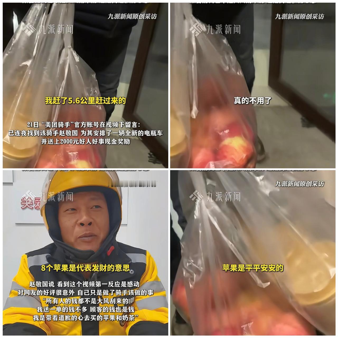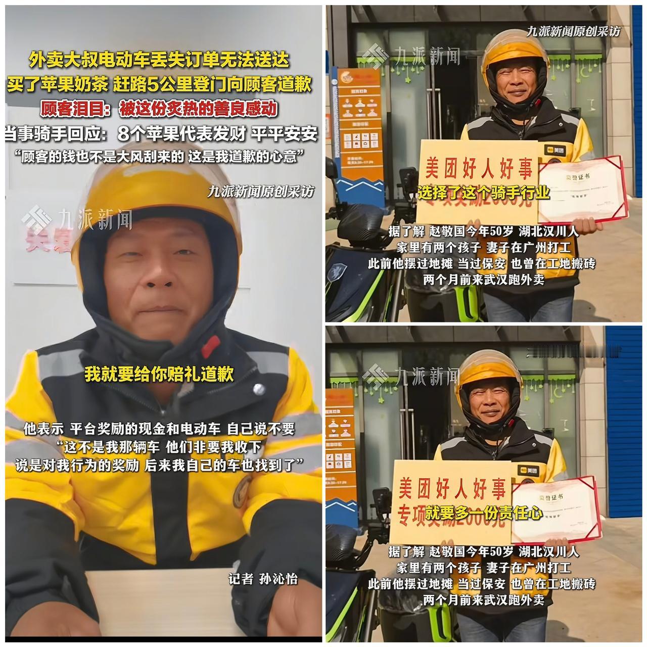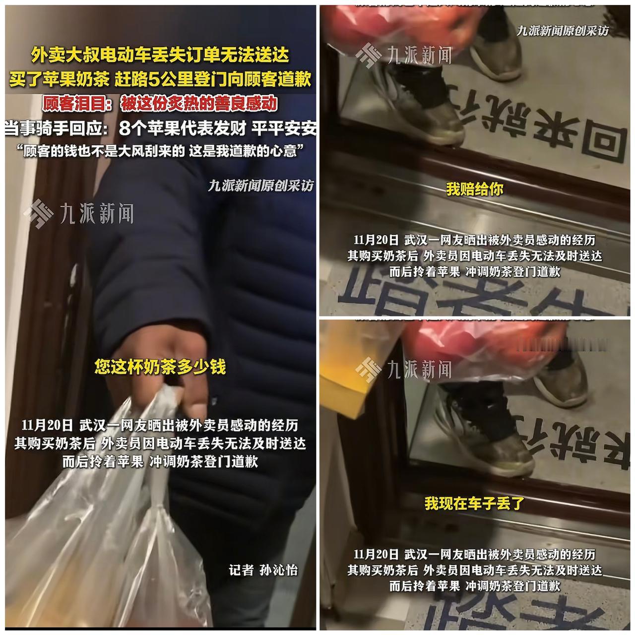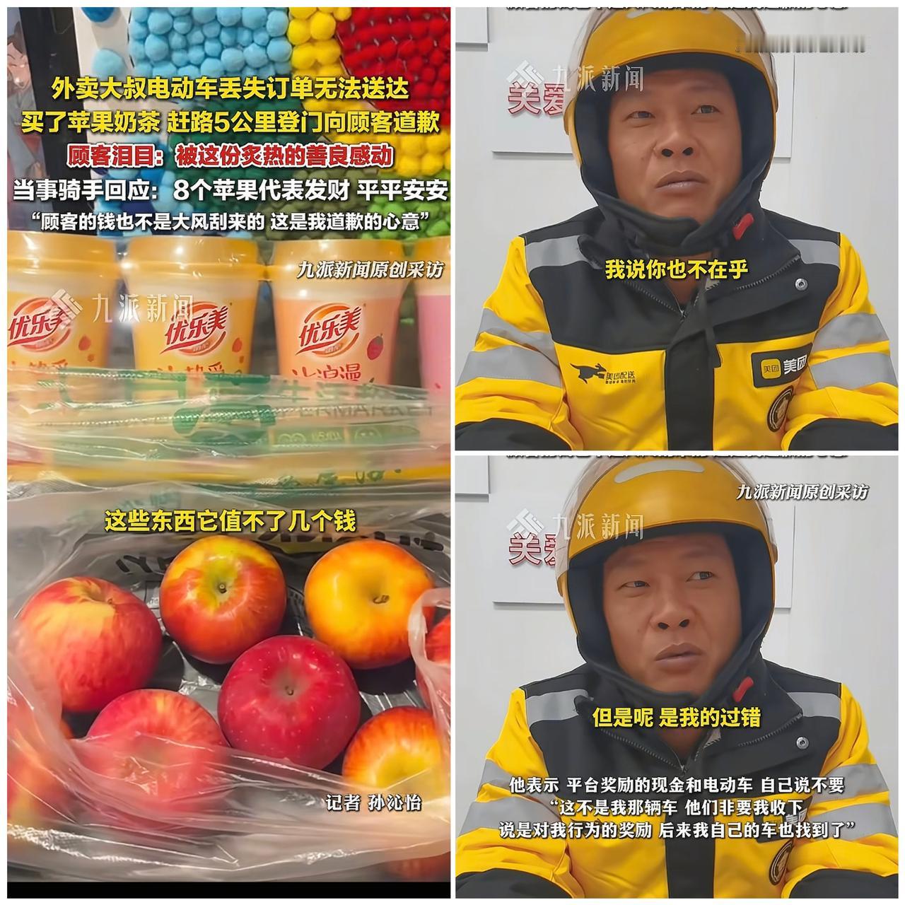 这大概是最温暖的“违约”故事了。 武汉一位外卖大叔的车被偷了,他强忍着委屈先给顾客打电话道歉还要赔偿。善良的姑娘免了他的单,没想到大叔竟步行五六公里,提着奶茶和苹果上门道谢。 在这个信用脆弱的时代,这位大叔用最笨拙的方式守护了比订单更重要的东西——尊严与诚信。 他送出的不是普通奶茶,而是成年人之间难得的体面。姑娘的宽容和大叔的感恩,恰好构成了社会最需要的善意闭环。 我们总说现在人情淡薄,可这对陌生人的互相成全,恰恰照亮了城市里最温暖的角落。美团的善后也值得点赞,但真正打动人的,永远是超越规则的人情味。 你遇到过哪些陌生人带来的温暖瞬间?欢迎在评论区分享那些治愈过你的小美好。