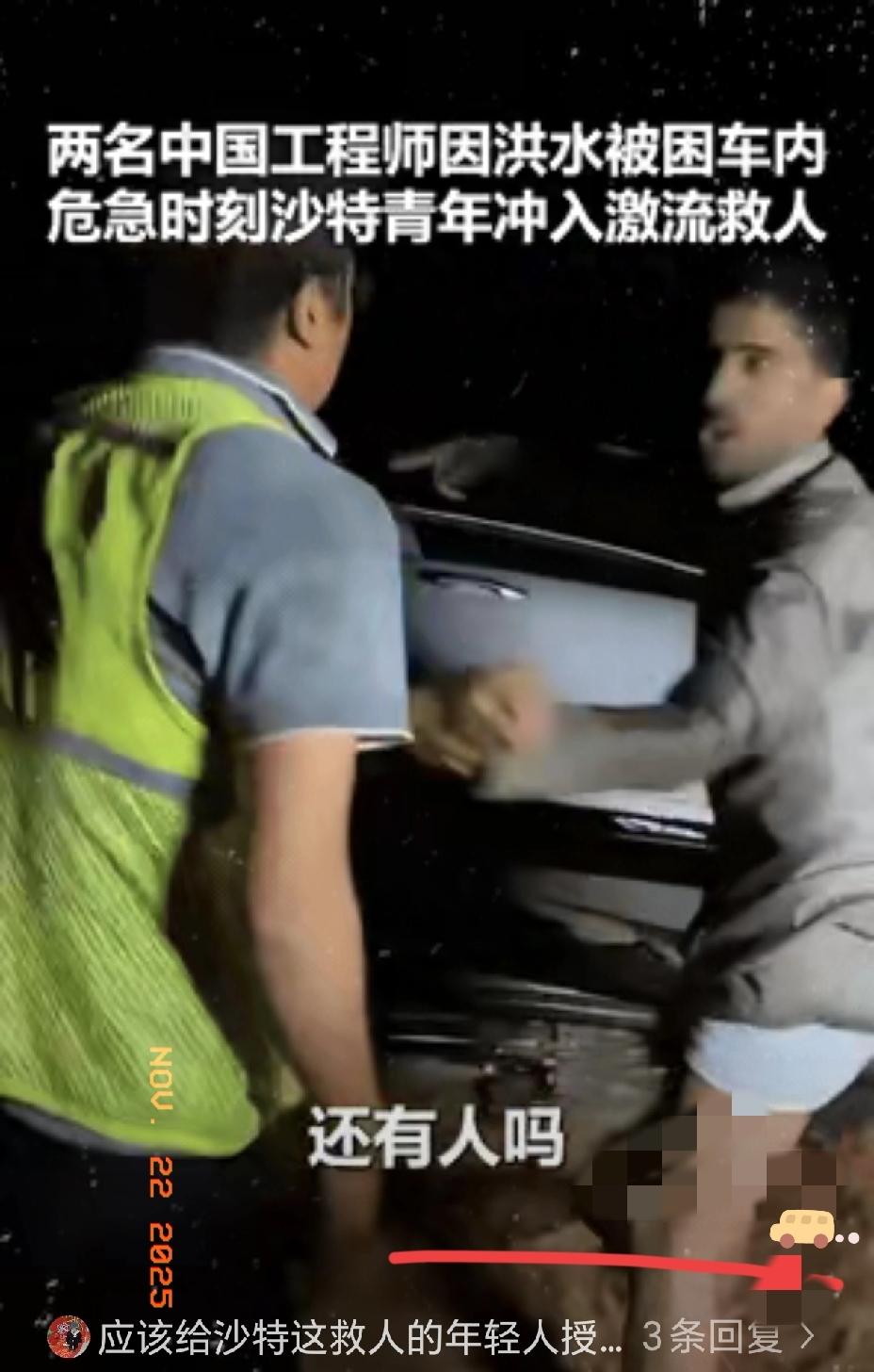 上人民日报了!沙特阿拉伯,两名中国工程师开车途中遭遇洪水车辆不幸侧翻,危机时刻,沙特青年冲入激流救人,拉出一个后,关切的询问是否其他人,在得到肯定的答复后,再次冲入激流中救人…… 事情发生在11月16日晚,沙特阿拉伯地区不幸遭遇罕见的暴雨袭击,短时间内大量降水形成了凶猛的洪水,城市的部分道路瞬间被淹没。 两名中国工程师下班后开车前往住处,不料走到一半,因为路面不平整车辆一下子侧翻了,车辆在洪水中剧烈晃动,情况十分危急。 那句带着口音的“朋友”,比任何华丽辞藻都更戳心。 沙特青年不顾自身安危,一脚踩在激流里、一脚顶在侧翻车上救人,救出一个又折返的身影,藏着不分国界的善意。 他们说“中国人为沙特做了很多贡献”,这份懂得与回馈,让救援多了份双向奔赴的温暖。 所谓国与国的友谊,从不是空洞的口号,而是危难时伸手的默契。 语言不通没关系,肤色不同也无妨,善良是人类共通的语言。 中国驻沙特大使的表彰,更是让这份民间善意被看见、被珍视。 这才是国与国相处的最好模样——彼此成就,危难相助。 你还听过哪些跨国暖心故事? 来评论区分享下这份感动~