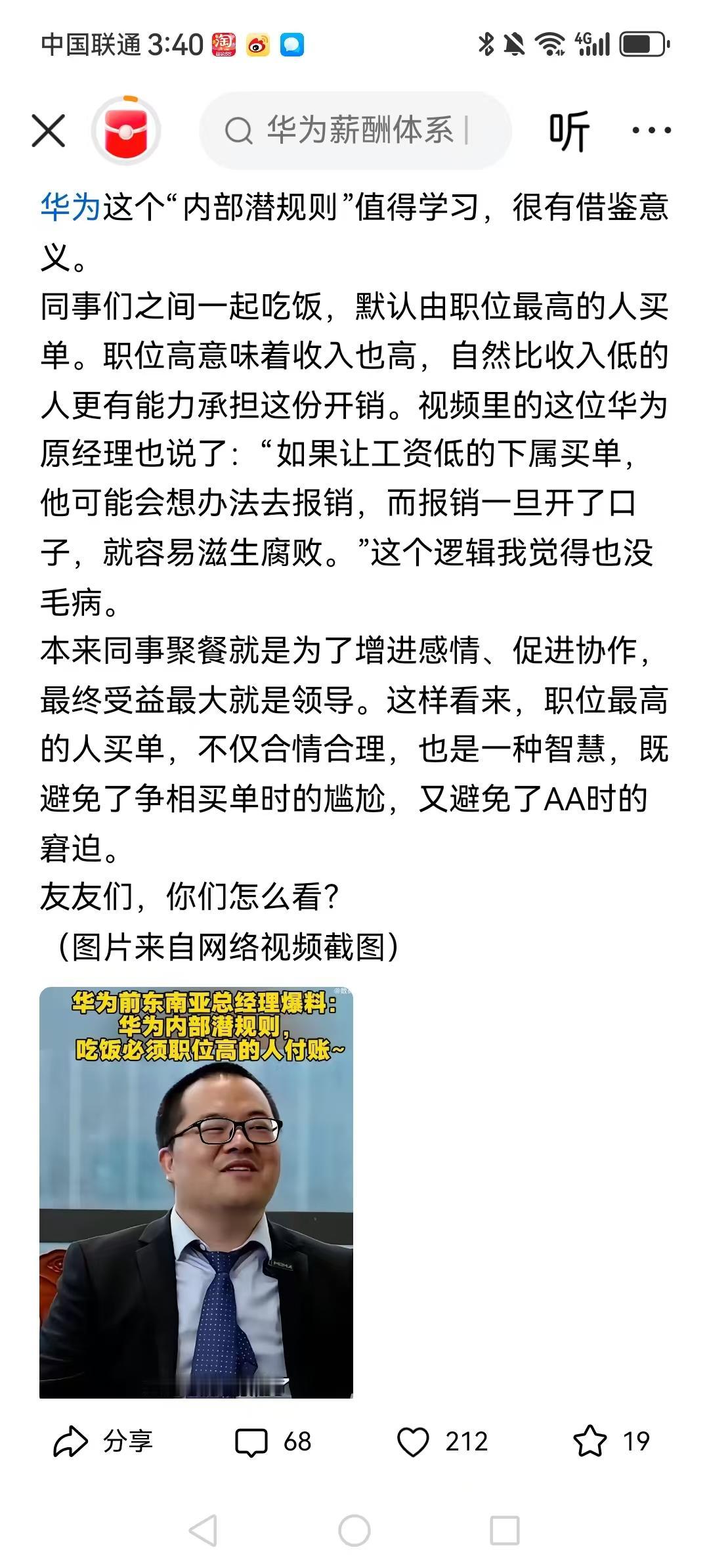 华为这个“内部潜规则”值得学习,年轻的时候在港资企业工作,那时候上下级同事聚餐,就有“有大食大”(职位高者请客)的口头禅。 这也得分人,有的领导年薪高又有钱,但是自己在外面干私活的业务费用都得想办法让单位处理。 这个习惯不错,领导座位坐的稳,都是大家的努力才能撑得住。 当然,AA制最好了!任何人都没有压力,谁也不欠谁的,多好呀! 要多问为什么?不然会干出东施效颦、邯郸学步的事。 不光是华为,基本上,大多数企业都是这个规矩。上级请下级吃饭,是关心,比较合理。如果由下级付账,那就成了巴结上级了,不合理!