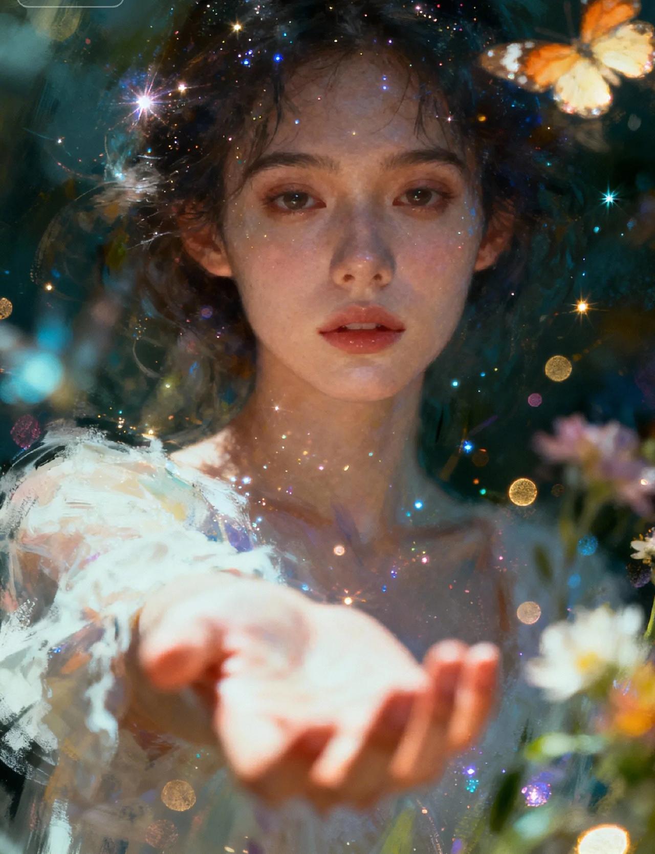 林间起了星子似的风,她指尖沾着露水,接住一片跌进掌心里的光。 蝴蝶落在发梢,把银河抖成碎钻,揉进她眼里未化的雾。裙摆漫过草尖时,沾了满袖的野花香——原来山野的温柔,都藏在她摊开的掌心,等风路过,就酿成一捧可以握在手里的月亮。似林间晨露轻洒 宛如仙子下凡