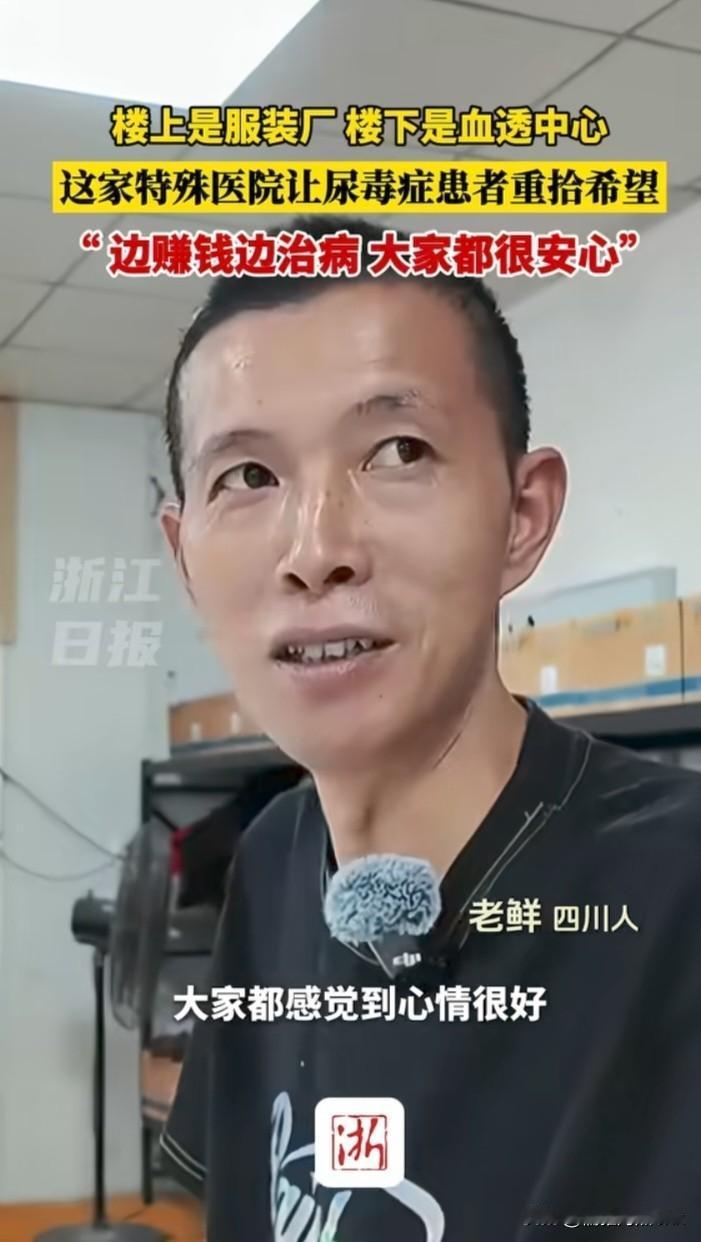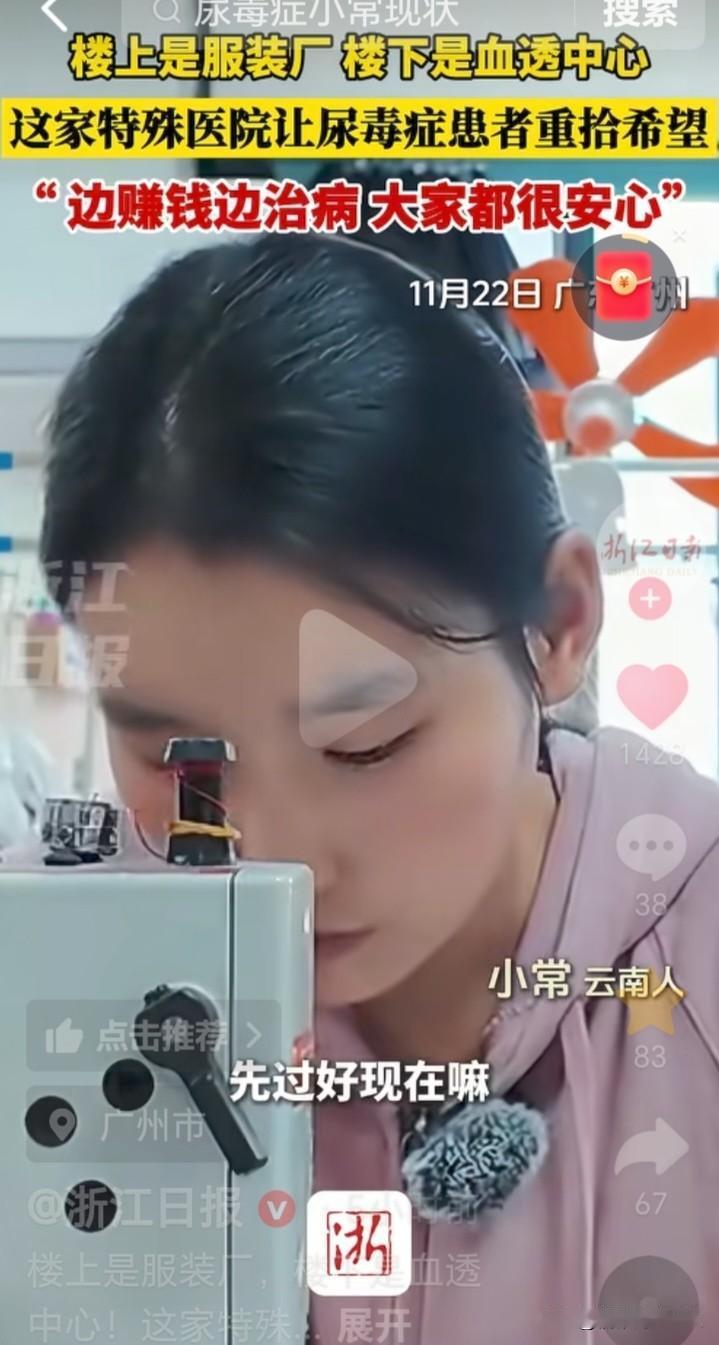 楼上缝纫机,楼下透析机,广州一工厂专收尿毒症病人,“肾友”们边赚钱边治病,重拾希望,过得安心。 广州有家宝树堂服装厂,厂里招收的员工多半是尿毒症患者,他们同时又都是宝树堂血透中心的病友,楼上缝纫机,楼下透析机,解决了工作,治疗也无后顾之忧。 他们来自全国各地,最大的60岁,最小的18岁,没有谁排斥谁,谁歧视谁,工作容易上手,靠自己挣钱治病,大家都过得很心安。 广州宝树堂透析中心的创始人谢强说,最初我们发现,患者需要工作是核心问题,创办一个服装厂大家观念比较一致,都能认识到要通过努力来改变自已,而不是通过施舍,我们主张帮助愿意努力的人,我们是有亏损的,但从长远来说,能够为患者打造一个新的治疗模式,这才是我们想要的东西。 授人以鱼不如授人以渔。治疗的不仅是一时的病,而是一辈子的病。给病人一份工作,就是给了一份心安。为他们创造这样的一个无歧视的环境,更利于病友的康复。 云南女孩小常说,先过好现在,这里比我们那边治疗还好一些。 四川男士老鲜说,大家在一起心情很好,都是同类中人,互帮互助很融洽。 谢强的善举不仅体现在为患者架起了生命通道,更体现在细节之处。透析日算公假不扣钱,每人每天额外补贴营养费30元,流水线降速20%,全厂购买“二次医保”,他将以工养医利于患者做到了极致,3年亏损300万元也义无返顾的坚持。 虽然命运之神没有眷顾他们,但谢強老板像黑暗中的一盏灯,燃烧自己,照亮他们,为他们开辟一条重生之路,令人敬佩!