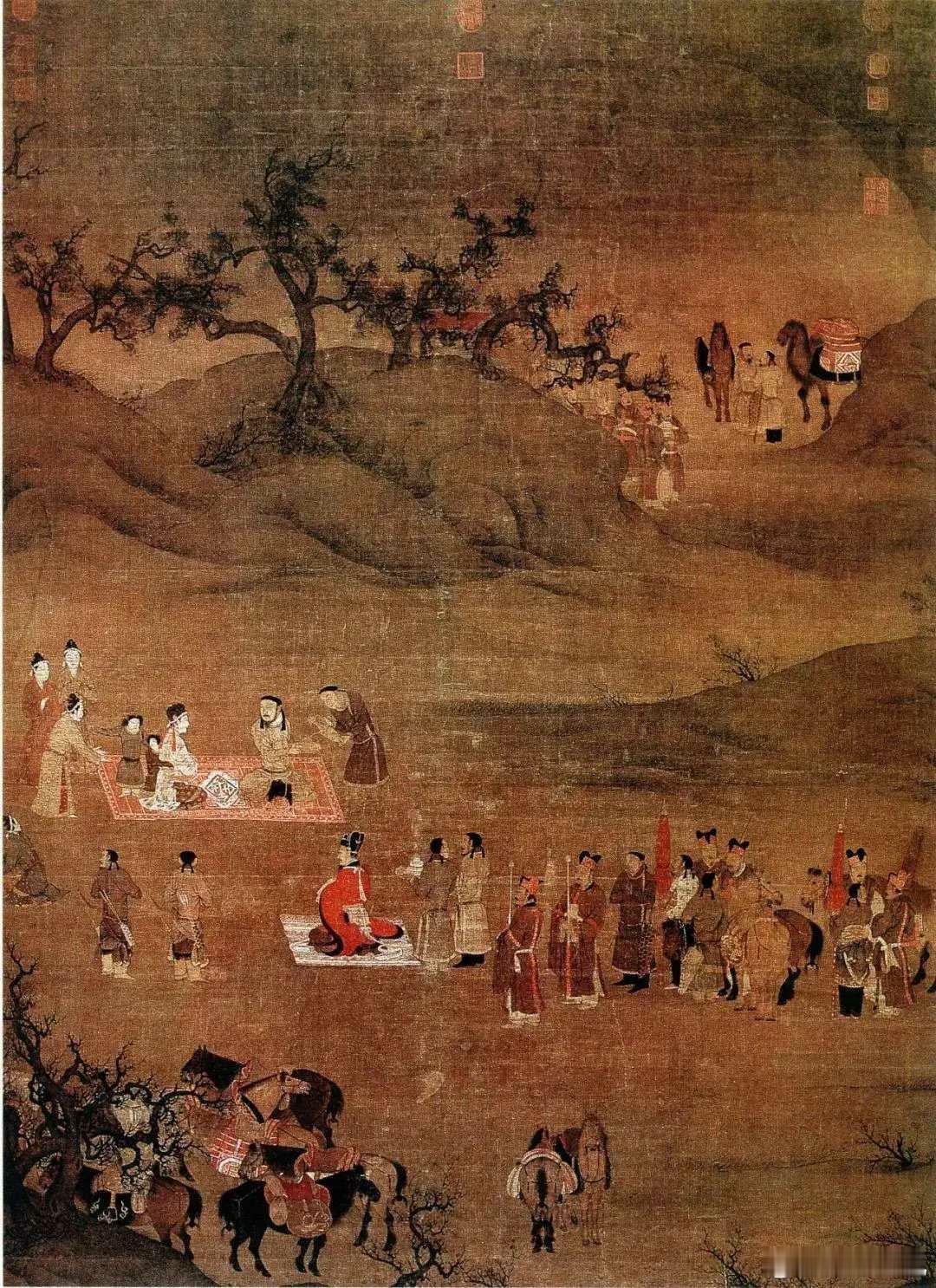 宋 陈居中 文姬归汉图。尺寸:纵29公分;横129公分。“文姬归汉”的故事是东汉末年,蔡文姬被匈奴左贤王掳走,并生下两个孩子。后来曹操派遣使臣将其从匈奴那里赎回。
