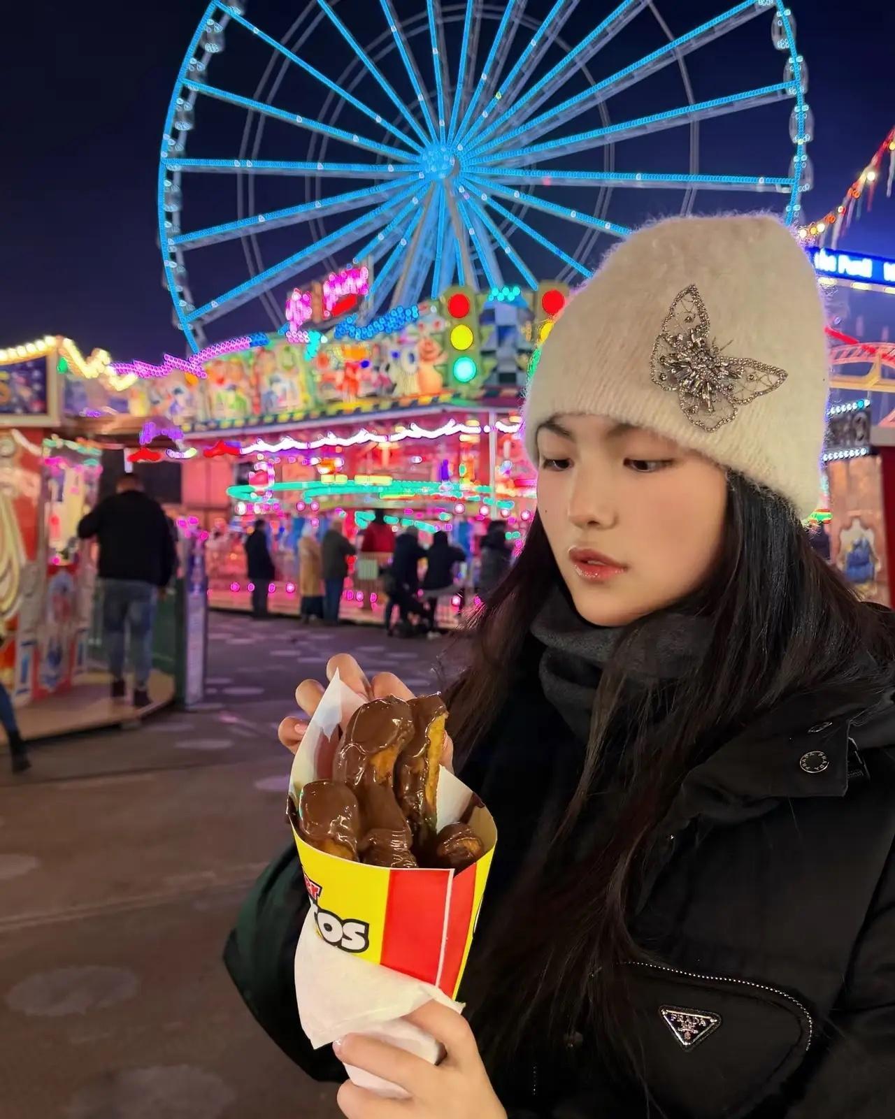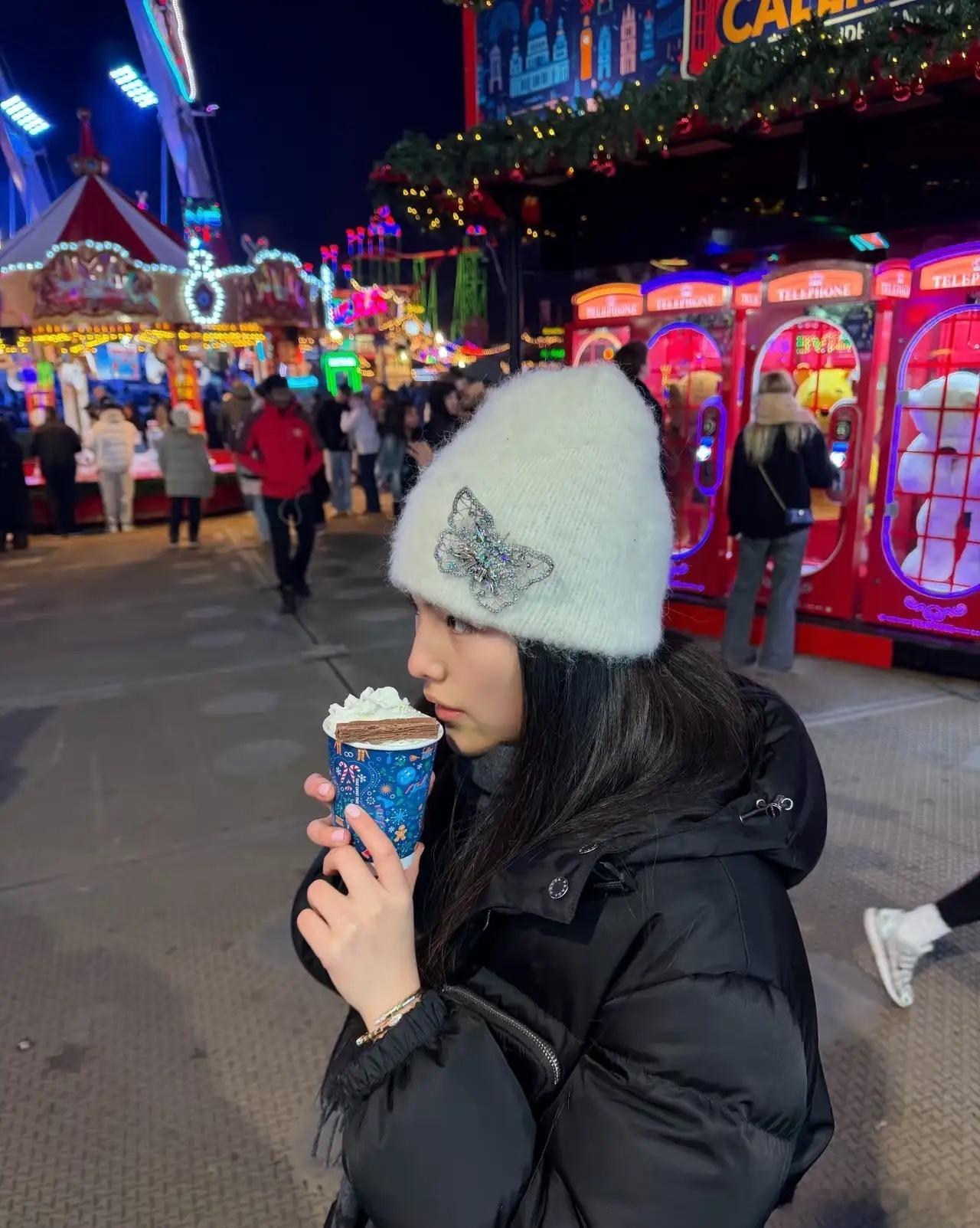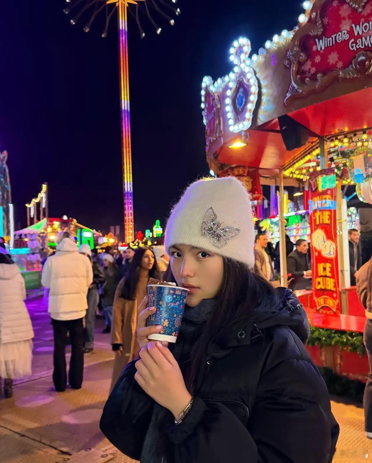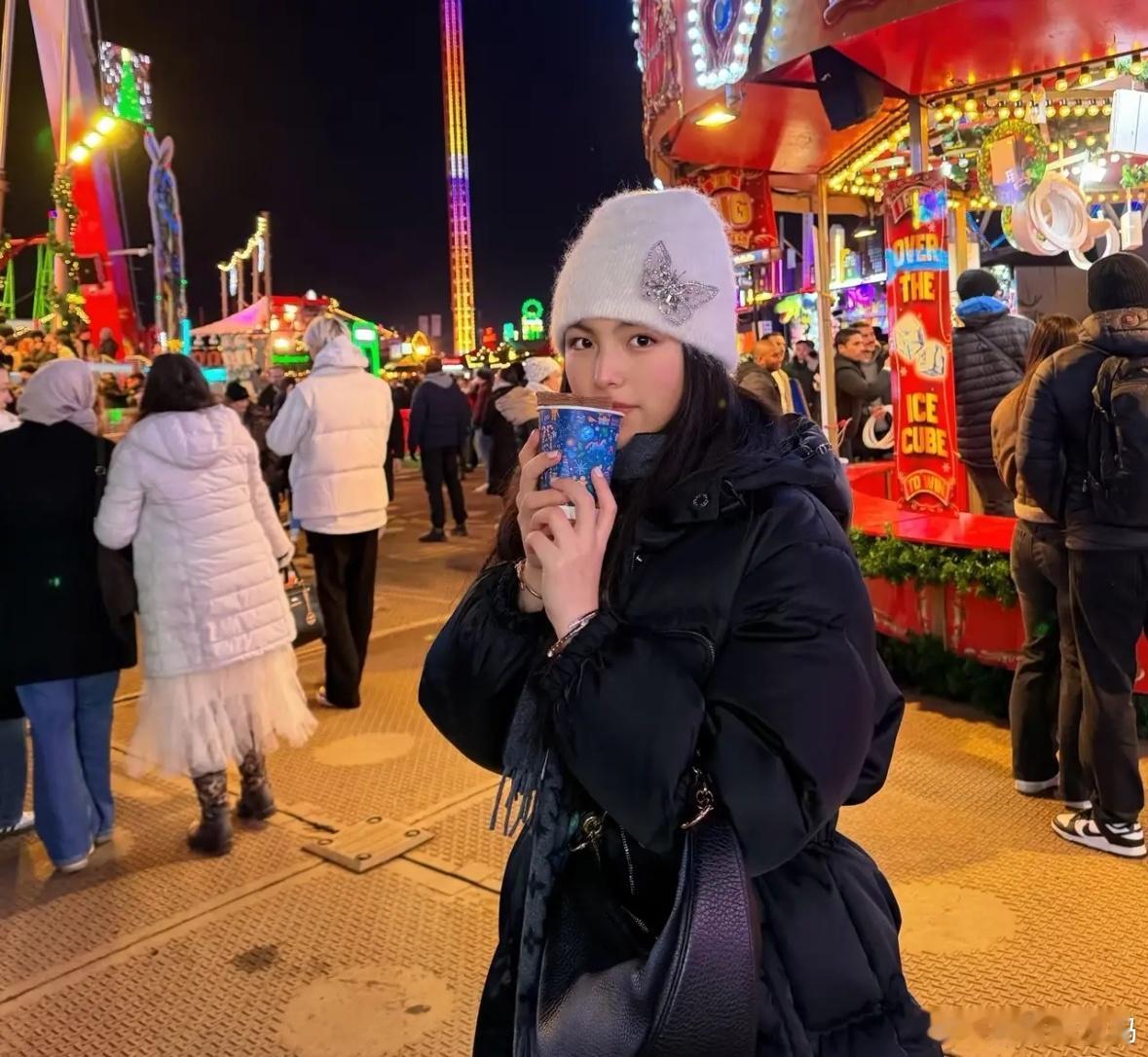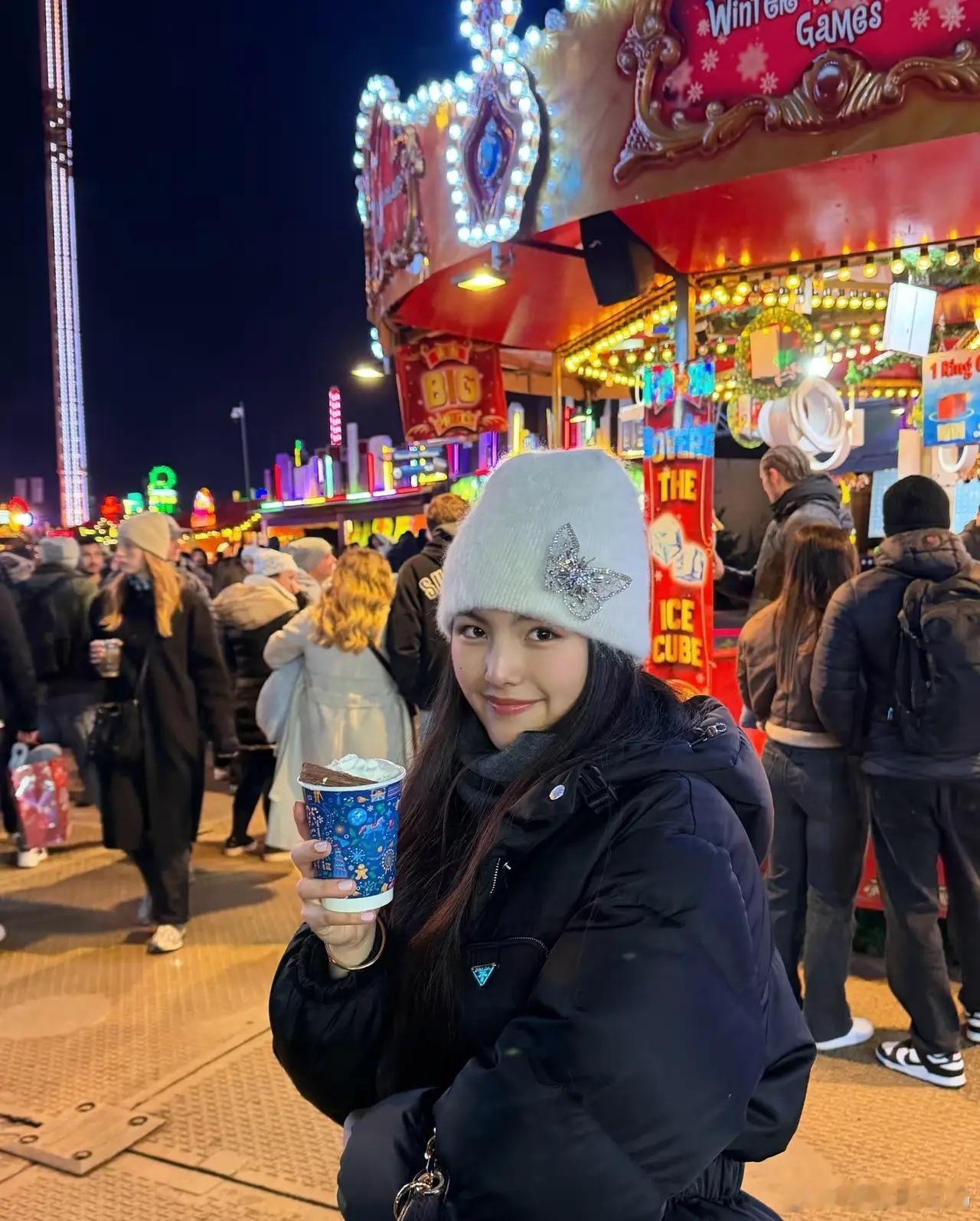 王诗龄晒晚上在英国逛街,冬季的氛围感太浓了,喝着咖啡好惬意!