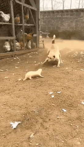 这小动物感觉有点像是黄鼠狼子,但是皮毛又是白色的,也许是基因变异了,虽然个头不大,但是身体特别灵活,和毛孩子玩的很开心,也许毛孩子抱着和它玩玩的态度,但是这小家伙也许有更大的野心!