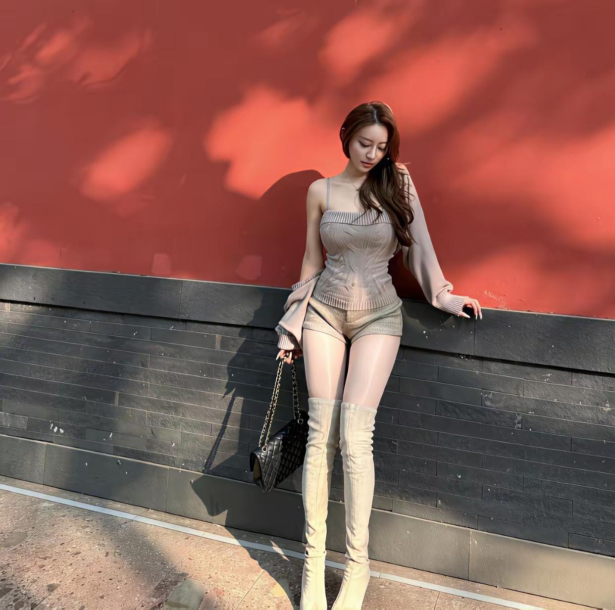 树影在红墙上漾开柔纹,人物姿态随性舒展,既有街头抓拍的生动自然,又藏着精心拿捏的慵懒——像某个秋日午后偶然驻足的片刻,松弛里裹着精致,日常中浸着诗意,每帧都像在说“恰好路过,恰好好看”。 以古典韵味的朱红墙为底色,衬出都市穿搭的柔媚利落,既借古墙的厚重沉淀画面质感,又用时装的轻盈消解厚重,让“复古背景+现代穿搭”的反差,变成一种新旧交融的审美张力。