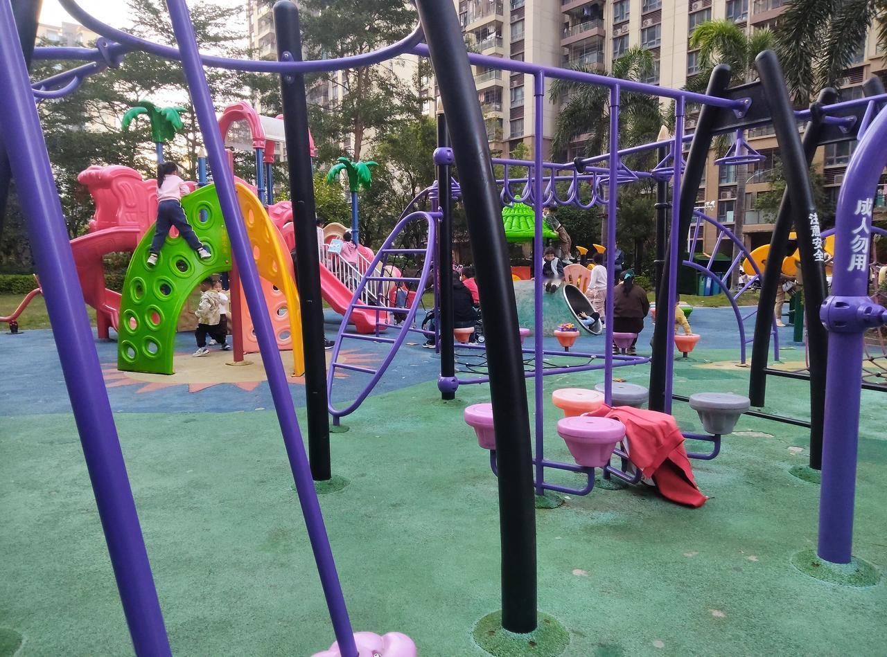今天周六傍晚, 小区游乐场可真热闹! 穿粉衣的娃正扒着绿爬架往上窜, 还有人蜷在黑滑桶里。 大人要么蹲旁边看, 要么坐那儿唠家常, 话题也离不开小孩子! 彩色地面衬得这一片全是烟火气, 小孩儿的笑能飘半栋楼~