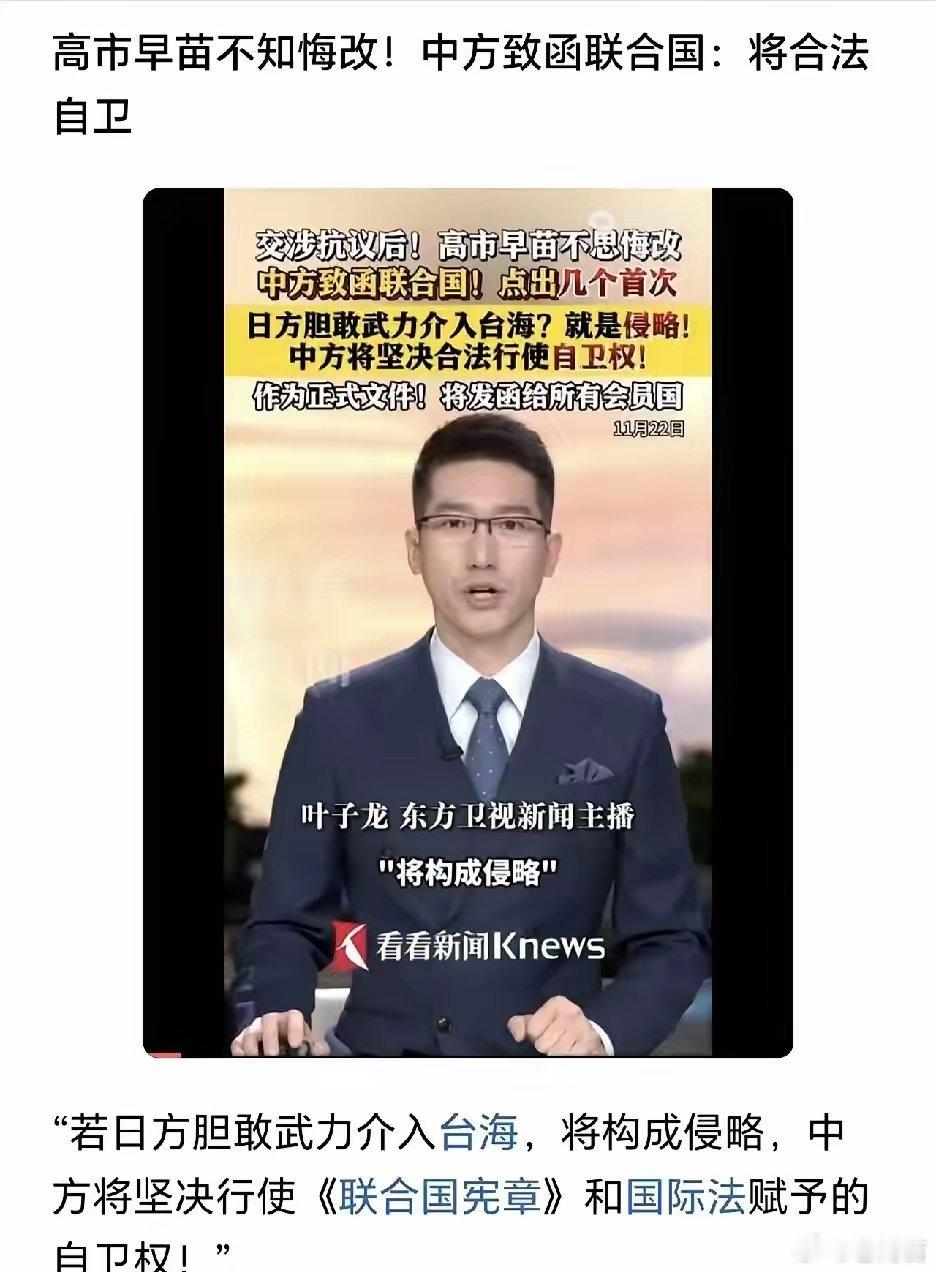 中方正式致函联合国:日本胆敢武力介入台海,那就构成对于中国主权的侵略,中国必将坚决行使合法自卫权。很明显,这不单单是对日本的警告,这是在告诉所有国家,台湾是中国的台湾,谁敢前来阻止统一,谁就是解放军合法打击对象!不用怀疑,那个时间点,真的快到了。所有岛上的台独,必须全部抓回来,接受人民的审判。