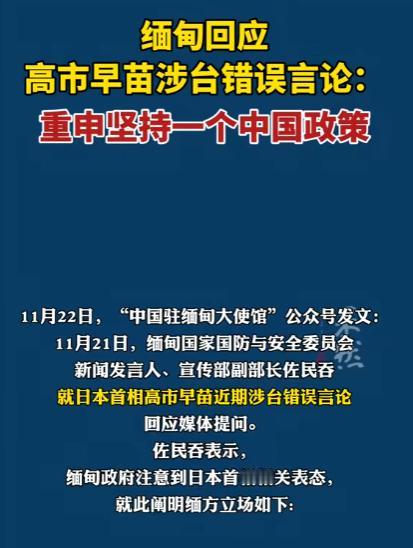 ·中日吵成这样,东南亚国家都假装看不见,沉默的同时,小心翼翼地保持着与中日的平衡,但总有例外!   昨天,中国驻缅甸大使馆传来消息,缅甸宣传部副部长佐民吞就高市近期涉台错误言论对媒体说:“缅甸政府坚持一中政策,中缅两国是友好邻邦,正携手共建全面战略合作伙伴关系,致力于构建命运共同体,缅甸政府高度重视并珍惜中缅关系,缅甸始终遵循和平共处五项原则,尊重中国主权和领土完整,并将一如既往支持中方维护国家统一的努力!”   佐民吞这番话,就是在日本政客高市早苗发表触碰中国底线的言论后说的。高市的言论直接挑战了“一个中国”原则这条红线,使得整个地区的气氛都变得紧张起来。   在这样敏感的时刻,周边许多国家都选择了三缄其口,不想被卷入这场风波,生怕得罪任何一方,它们这种“战略模糊”的做法,其实是一种精明的自我保护,想在夹缝中求生存。   但缅甸这次没有随大流。它的选择不是心血来潮,而是基于两国七十多年交往沉淀下来的深厚情谊,中缅之间流传的“胞波”情谊,早已从一句称呼,深化为实实在在的利益捆绑。   从共同构建“命运共同体”的宏伟蓝图,到脚踏实地推进“中缅经济走廊”建设,双方的信任度已经远超那些只看眼前利益的投机算计,所以,缅甸的明确表态,是这种深度互信关系下的必然结果。   更重要的是,缅甸的行动依据是它自己一直倡导和坚守的“和平共处五项原则”,当别国政客的言论侵犯到“尊重主权和领土完整”这条核心原则时,缅甸站出来发声,既是支持中国,也是在捍卫自己立国的外交基石。   它用实际行动告诉所有人,在国家主权这种大是大非的问题上,容不得半点含糊,更没有打太极拳的空间。   把缅甸的果断与东南亚另一些国家的犹豫放在一起看,对比就非常鲜明了,那些选择沉默的国家,看似聪明,实则在原则问题上失了分。   缅甸的仗义执言,像一面镜子,照出了某些势力“明哲保身”背后的怯懦,也让那些企图干涉中国内政的外部势力和岛内“台独”分子脸上无光。
