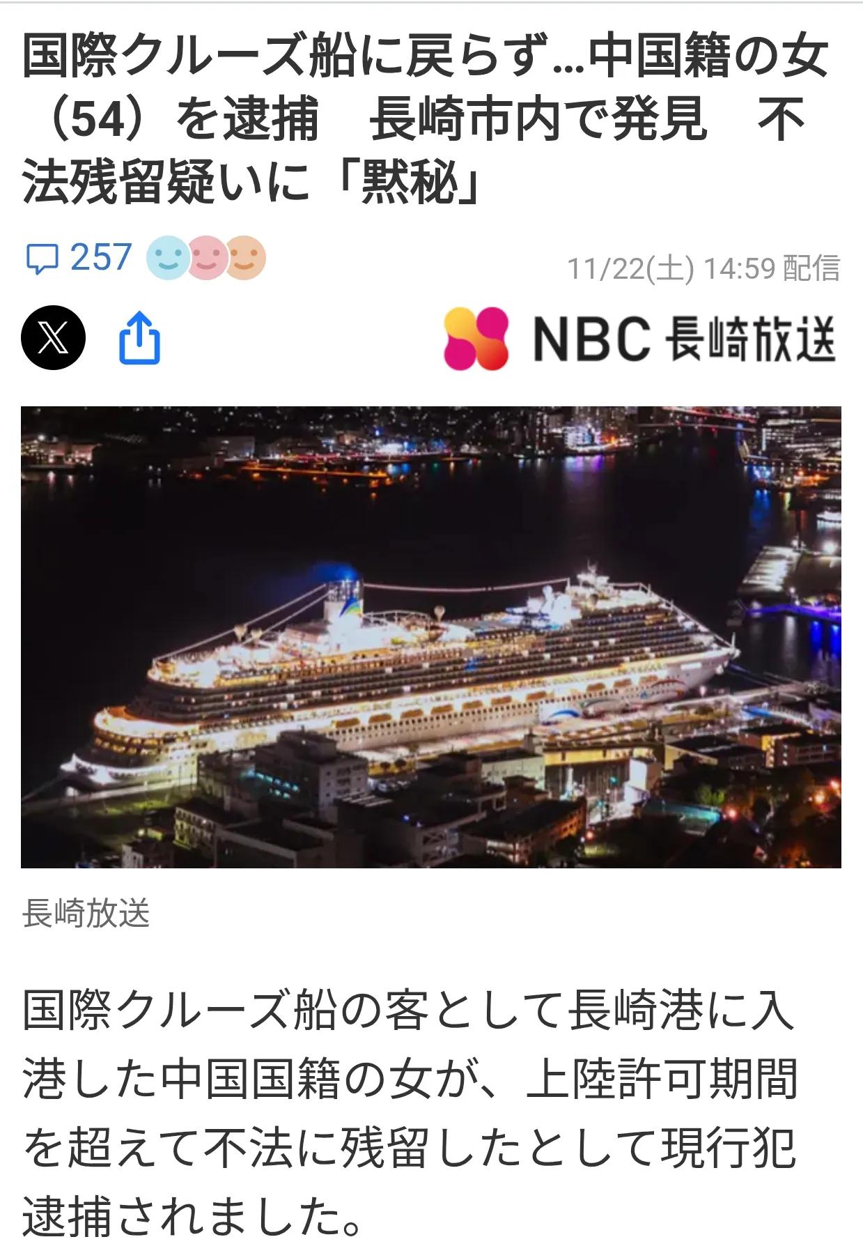 免签不是“赖着不走”的通行证! 中国女子长崎非法滞留被抓 教训太深刻…… 11月22日,54岁中国女子因邮轮观光登陆许可逾期未归,在长崎被警方逮捕的消息,看得人挺唏嘘。 日本的船舶观光登陆本是免签便利,核心要求就是离港前必须返回邮轮,这是明明白白的规则。 别以为逾期只是小事,日本对非法滞留处罚早就明确:最高罚300万日元,强制遣返后还可能5到10年不准入境。 不管是心存侥幸想打黑工,还是有其他隐情,违背规则就要付出代价,还可能影响国人出境信誉。 出国旅游或出行,遵守当地法律和签证规则是底线。 免签给的是便利,不是特权,任何国家都不会纵容非法滞留。 你觉得出门在外,该怎么避免踩这类规则红线?来评论区聊聊~