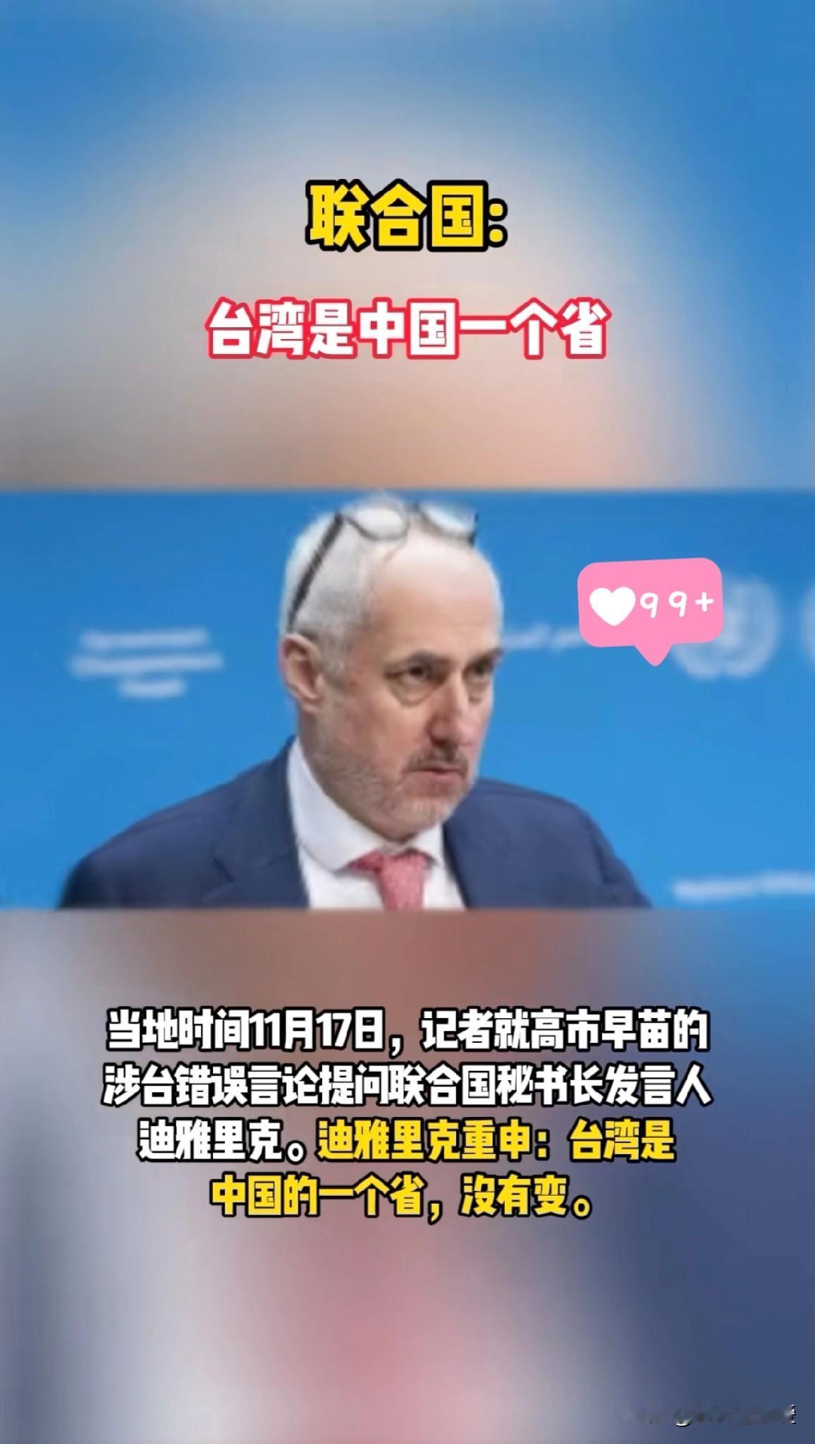日本首相高市早苗近几日公开声称“台岛是日本的”,企图借此炒作“日本恢复大国地位”,谁知没过几天,就遭到了联合国的啪啪打脸。 联合国秘书长发言人迪雅里克重申立场:“根据1971年通过的联合国大会第2758号决议,世界上只有一个东方大国,东方大国的领土是不可分割的。” 这一下直接让高市早苗成了日本的笑柄,高市早苗此次国际炒作,彻底沦为笑话。高市早苗出身于日本世家,家族背景保守,思想从小也受到日本右翼思想熏陶,成年后也一直在日本政坛保守派活动。她曾公开质疑“东条英机”等战犯接受历史审判时“真实想法”,并且坚称“二战时,日本是被美国强迫参加的”,这与日本右翼“先否认后洗白”的思路一脉相承。 近年来高市早苗多次发表强硬言论,像“为了不让重蹈覆辙,我们有必要做好军事准备”等等,试图迎合国内日益高涨的右翼势力,并掩盖日本经济萧条、民生困苦等问题。 高市早苗此次言论并非出自本心,而是经过深思熟虑后,揣摩人心而作出的投机之言。没想到这招居然搬起石头砸了自己的脚,联合国的表态,不仅确认了东方大国国际合法性的法理依据,更是拆穿了日本企图分裂他国领土、重新军国化扩张的危险图谋 。高市早苗一心想带领日本回到二战前,但她忘了,历史法理永远站在正义的一边,任何分裂他国领土、侵略他国的行径,都逃不出被审判的下场。大家对此有什么看法?欢迎评论区留言!台湾统一最有可能以什么样的方式 你认为两岸统一的阻力有哪些 高市早苗的涉台言论会有什么后果 高市早苗暗示武力介入台海你怎么看