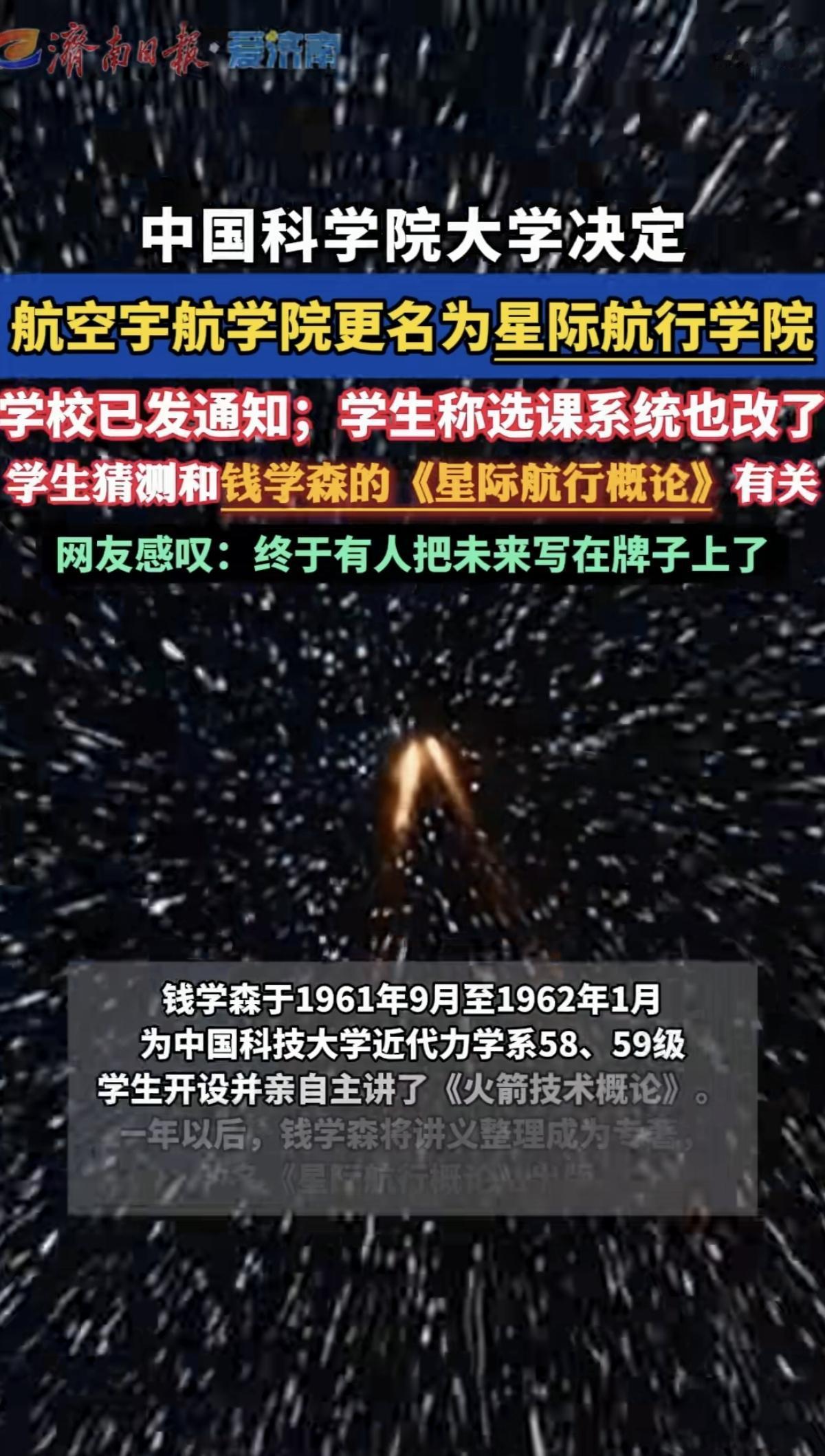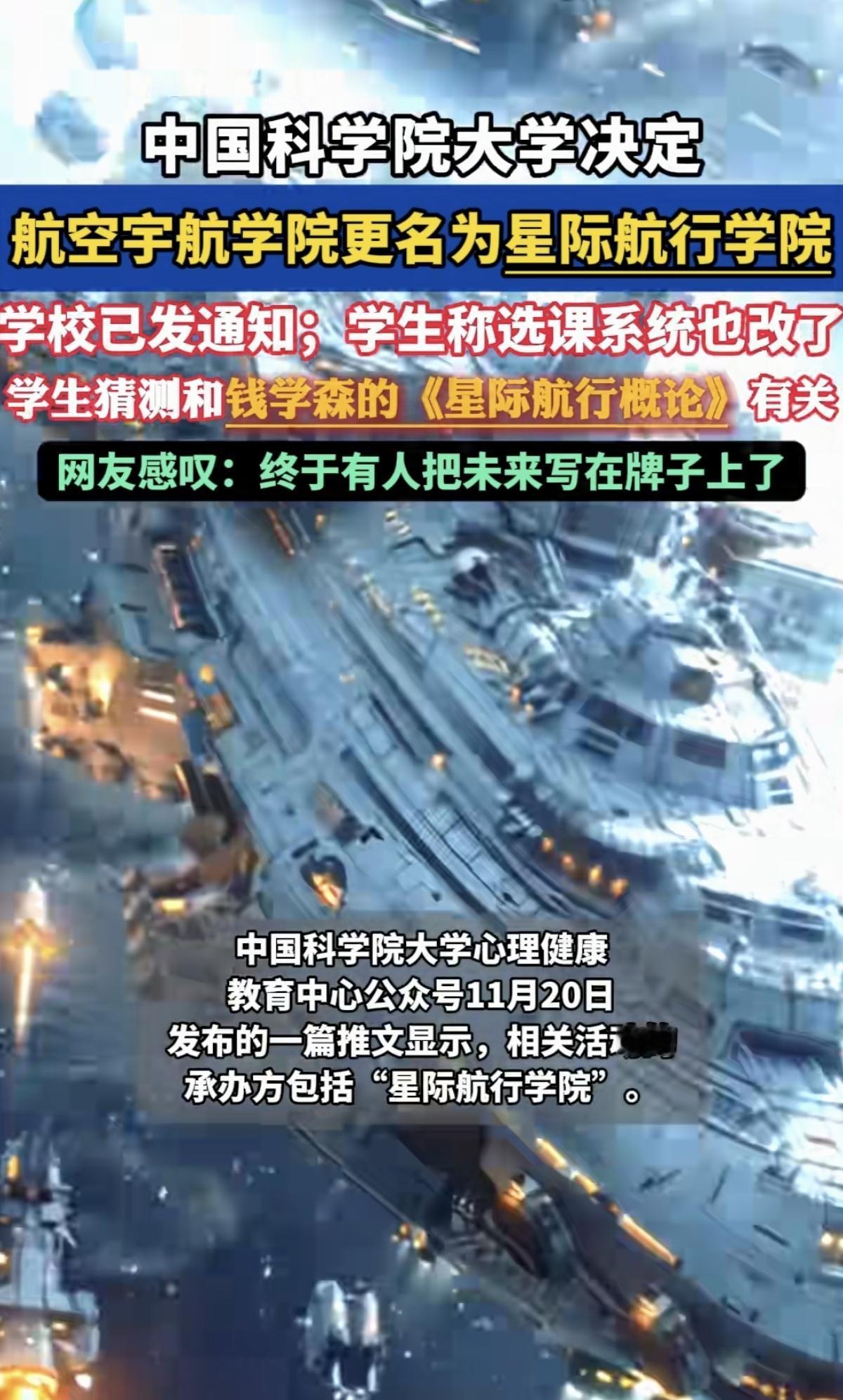 “航空宇航学院”更名为“星际航行学院”,足以说明我们国家的野心之大。 我们的目标不是小小的地球,而是星辰大海 以前总觉得“南天门计划”有点虚,现在越来越清晰了,我们未来的星际作战计划正在一步步执行 这才是超级大国该有的雄心