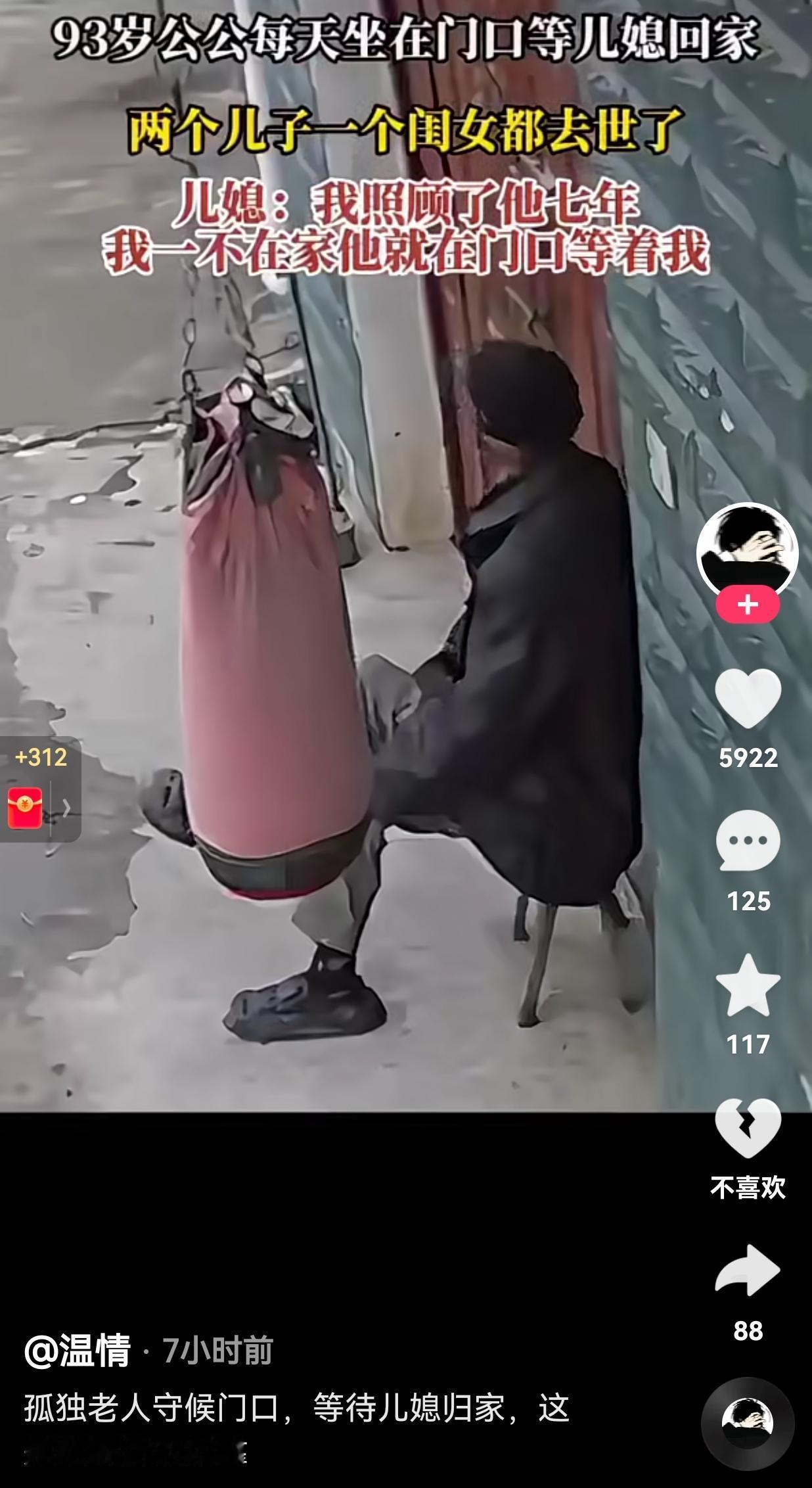你只管善良,上天自有衡量。93岁的老人每天只有一件事情,那就是坐在门口静静地等待着儿媳妇回家,每当儿媳妇看到老人孤零零地坐在门口,心里也很不是滋味,可是,她也已经竭尽全力了! 据儿媳妇讲述,老人有两个儿子和一个女儿,之前老人过得挺幸福的,家里也有人陪,只不过现在都已经去世了。我已经照顾他七年了,我一不在家,他就在门口等着我。 网友看到后评论说,儿媳已经是老人的精神支柱了,所以,儿媳妇不在家老人就会在门口等着。 还有的网友说,这个年龄阶段的智商就相当于一个孩子,老人坐在门口等着他的亲人,说明他对儿媳妇有依靠了。 老人是不幸的,三个子女都走在他的前面,致使老人到老了没有什么依靠。可是,老人又是幸运的,因为他拥有一个好儿媳。 尽管,日子可能没有之前好,但是,儿媳妇看到老人孤苦无依,并没有置之不理,而是主动承担起赡养老人的责任。 通过这件事,也说明儿媳妇是一个孝顺懂事的人,当然了,因为有了这样的儿媳妇,老人才能安享晚年! 大家觉得呢?欢迎大家评论区讨论留言。