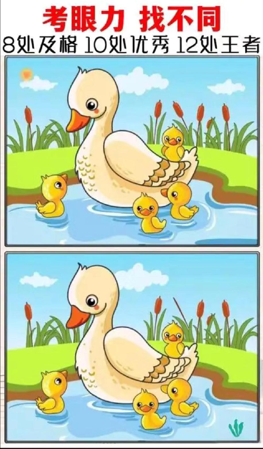 考眼力:鸭妈妈带小鸭的图藏了12处不同,我眼睛都盯酸了,你能及格吗?