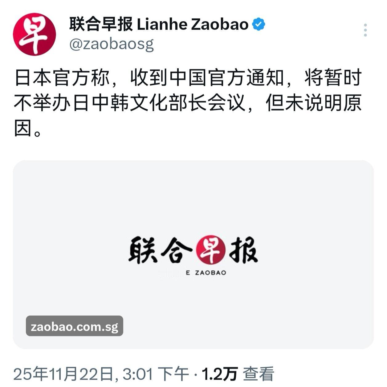 日本官方称,收到中国官方通知,将暂时不举办中日韩文化部长会议,但未说明原因。 恕我直言,日方心里比谁都清楚会议为何取消。当前中日关系高度紧张,高市早苗至今未收回其涉台错误言论,甚至传出要参拜靖国神社的风声。在这种背景下,我们怎么可能照常进行文化部长级会谈? 会议暂停是必然的选择,在日本当局认真反省历史问题、彻底纠正错误言行之前,这样的对话毫无意义。等日方真正拿出诚意,深刻反省,我们再谈不迟。 如果日方迟迟不反省,等待他们的将是更大规模的反制措施。 新闻来源:联合早报(11月22日)