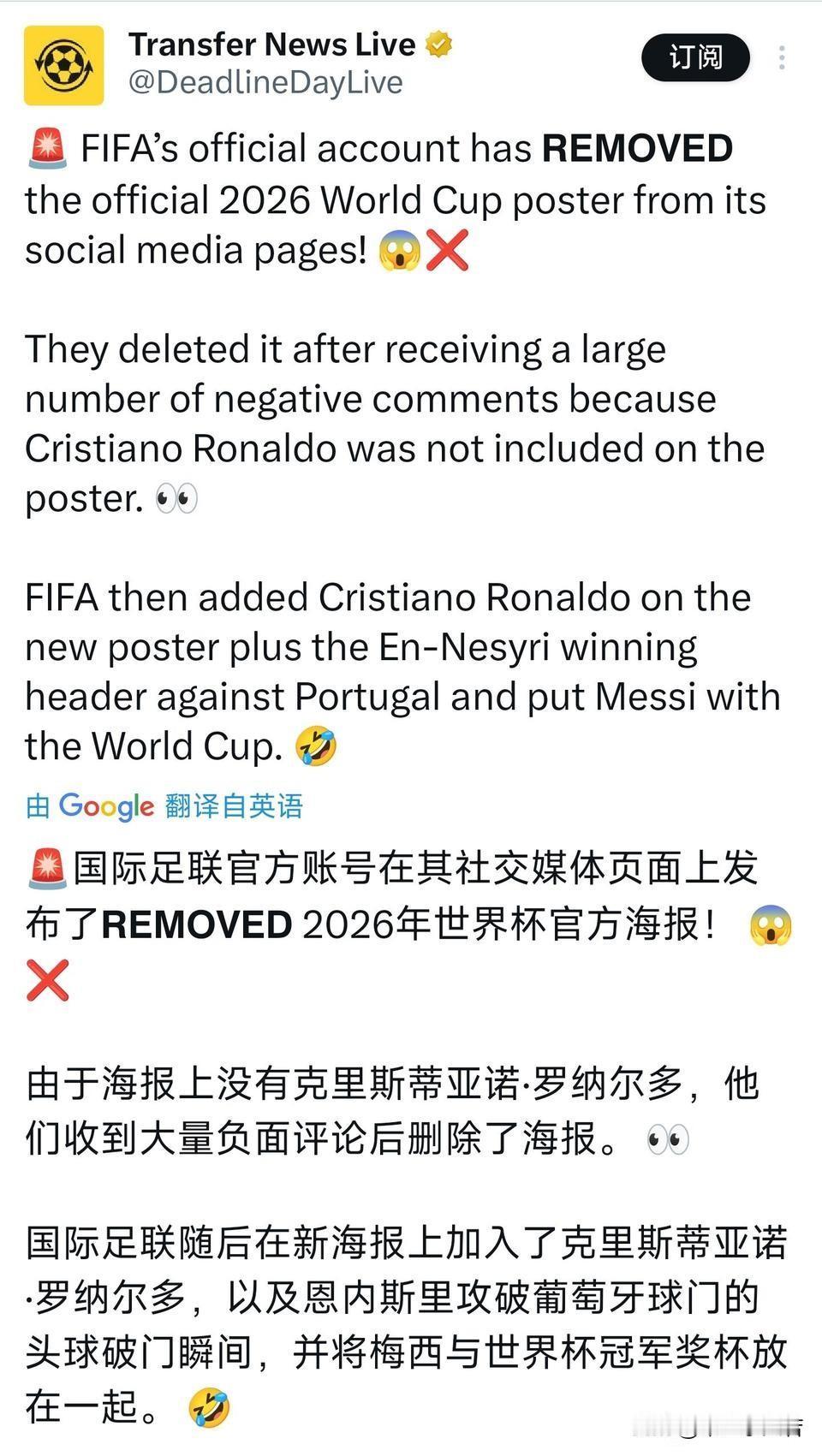 克里斯蒂亚诺罗纳尔多!国际足联是懂流量的,在国际足联公布的世界杯宣传海报上没有克里斯蒂亚诺罗纳尔多的形象,然后就被喷的换海报了。估计国际足联是觉得克里斯蒂亚诺已经老了,不会有啥支持者了,从流量层面考虑他们没有选择克里斯蒂亚诺。 但被喷了以后国际足联不仅仅把克里斯蒂亚诺罗纳尔多加上了,而且还把梅西手捧世界杯给加上了,国际足联不仅仅是记仇的,也是懂流量的,这么多年了还不忘记把两个人竞争的事情当流量。 今年的世界杯又是一次众多球员的谢幕演出,我们将一次性失去过去十几年的三位金球奖球员,克里斯蒂亚诺罗纳尔多、梅西与莫德里奇都在在本次世界杯后退出国家队,估计也离退役不远了,他们老了,我们也老了,如果放在十年前现在就会开始期待世界杯了,但今年都没有看世界杯的想法,后来想到过去十几年最好的三位金球奖球员将集体离开,算是给了自己一个咬牙熬夜的理由。