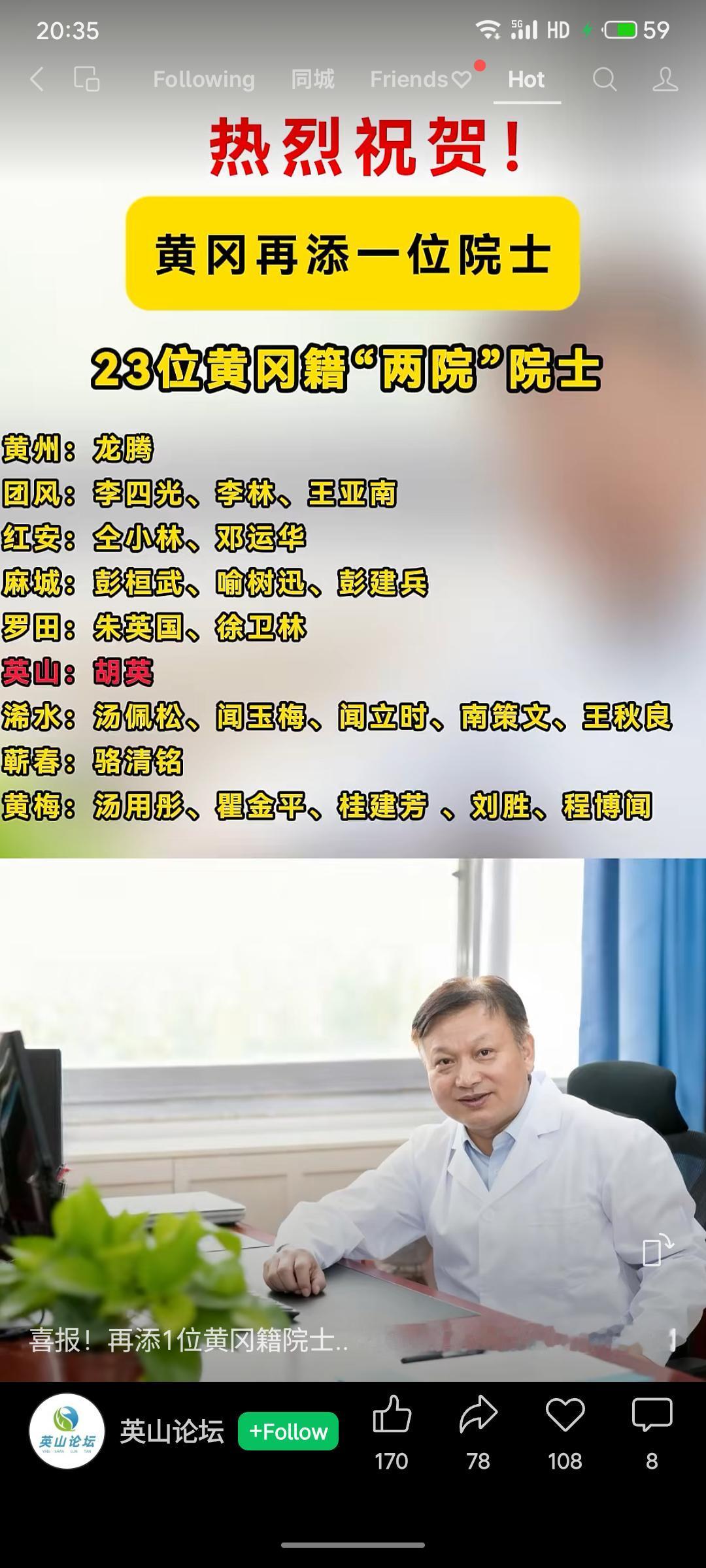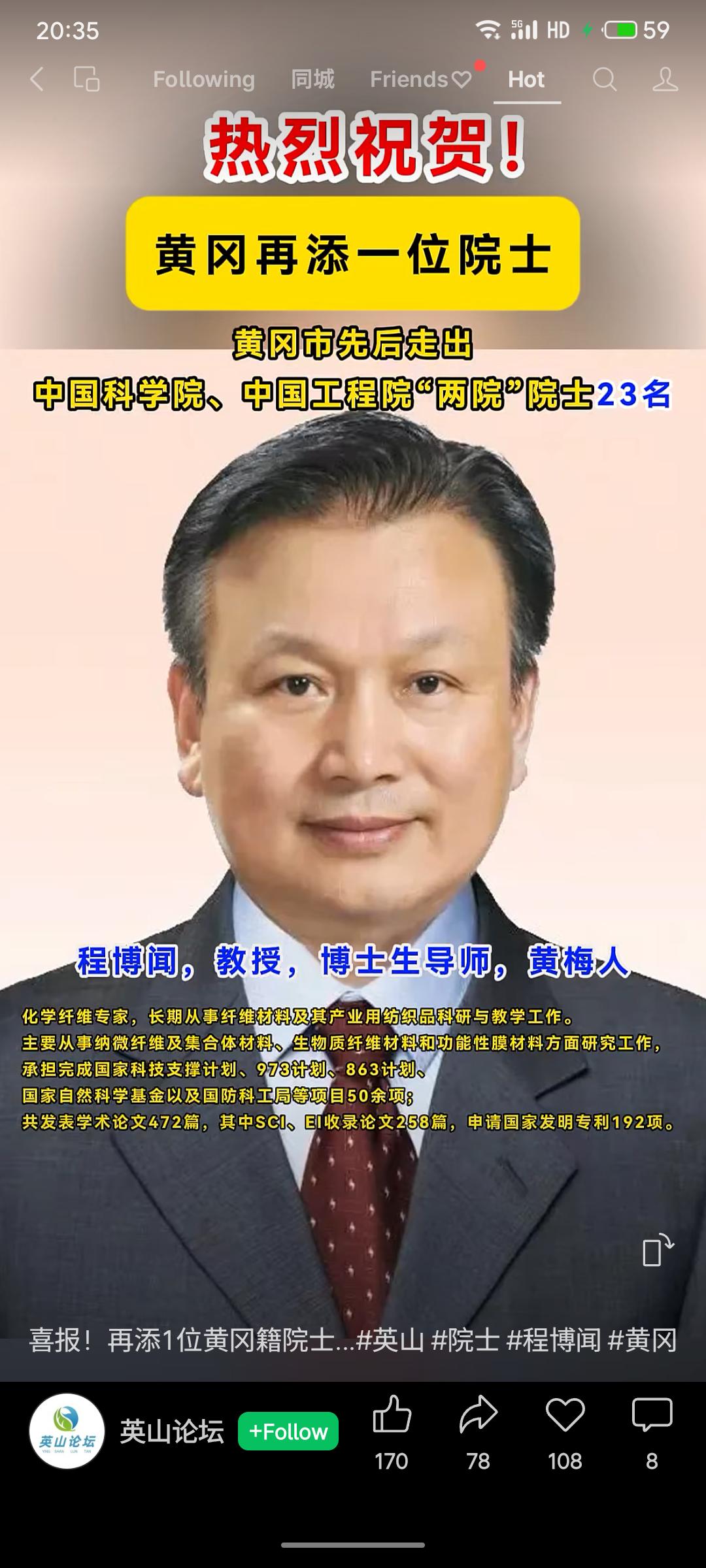 黄冈籍院士再添一员,总数达23位。新当选的程博闻院士为黄梅人,系化学纤维专家,长期从事纤维材料研发,承担多项国家级科研项目,发表大量学术论文并拥有众多发明专利。