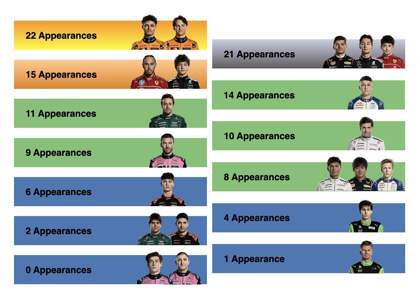 本赛季F1车手的Q3次数统计