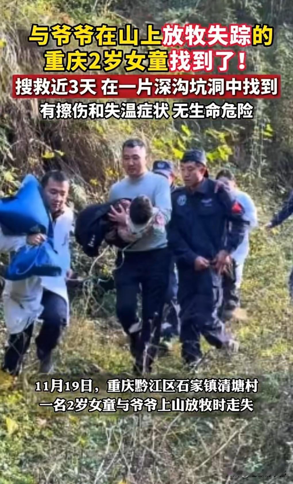 能够活下来真的是个奇迹!特别是晚上那么低的温度,没有被冻死已经是万幸了。 11月19日,两岁女童与爷爷上山放牧,女童失踪。 在失踪搜救近三天后,找到了女童,女童有些失温和擦伤,无生命危险。 这也敲响警钟,带娃一定要认真负责。 不是每次都这么好运气的。