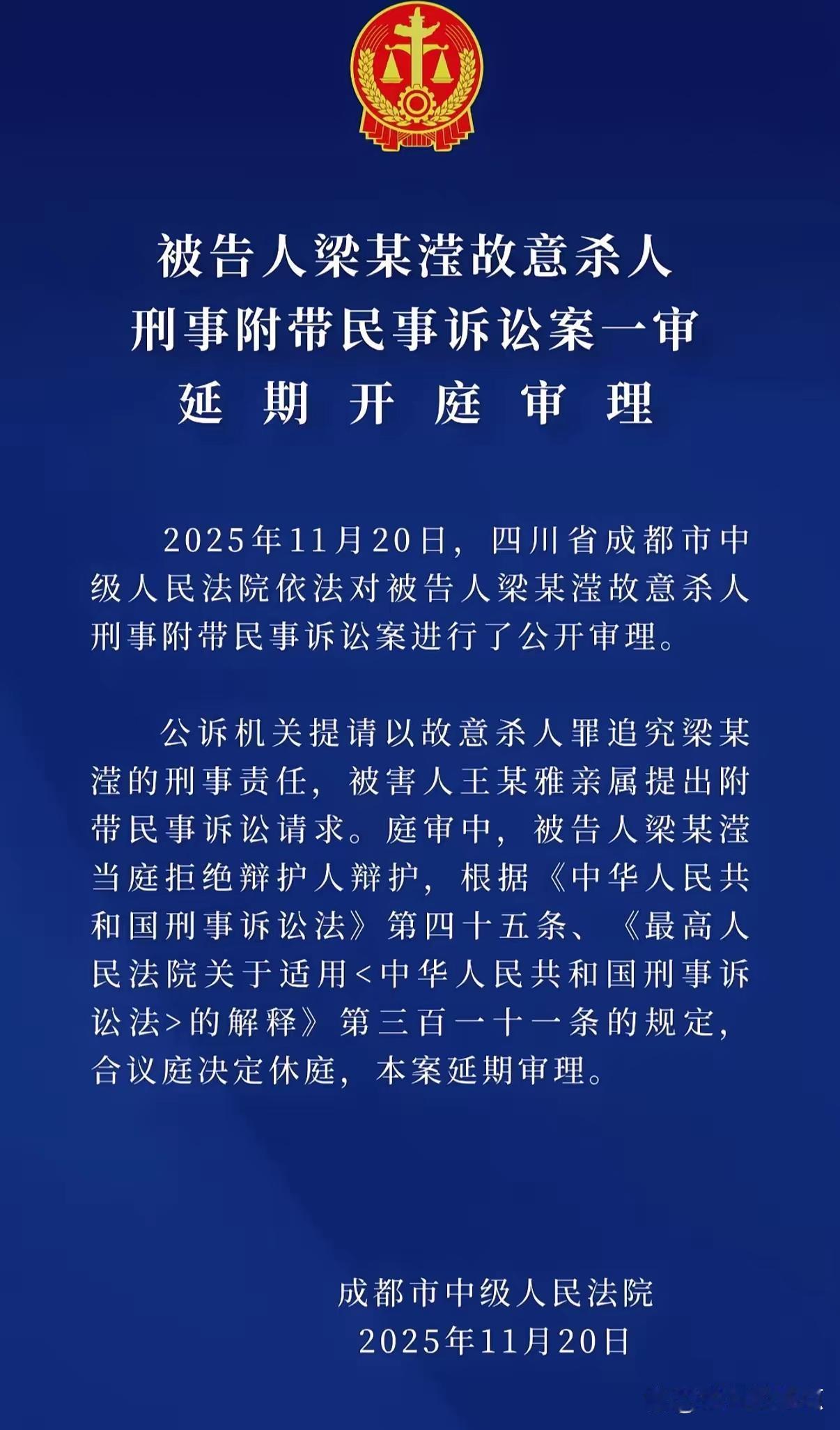 成都门口血案:梁某莹,谜一样的女人? 坊间传闻,她35岁,离异,与被害的27岁成都才女同住一个小区。可无论案发风暴多猛烈,还是一审庭审后舆论多沸腾,网络上竟搜不到她一张正脸照,仿佛人间蒸发。 是谁,在替她遮风挡雨? 耐人寻味的是,命案发生后,率先带走她的并非警察或物业,而是她的父母,直奔精神鉴定机构。更蹊跷的是,梁某此前从无精神治疗记录,却一夜之间“顺利”拿到一纸“精神异常”证明! 庭审现场,她一句“正当防卫”试图脱罪,声称带刀只是“防身”,还喊“失去自由太冤”。更离谱的是,她当庭炒掉律师,强行拖慢审理节奏,法庭却未予任何惩戒。无奈之下,受害者王某雅的母亲只能开启万人直播,哭求公道。 从案发到庭审,梁家人忙前忙后,似乎只为“护犊”。而王某雅,不过是无数潜在受害者中最倒霉的那一个。 精神病不是免死金牌!那份疑点重重的鉴定报告、法庭上明目张胆的“拖延战术”,以及她在网络世界里的“零痕迹”,到底替谁掩盖了真相?当一条鲜活的生命被残忍终结,凶手却凭几纸“理由”逍遥法外,我们口中的公平与正义,难道只能让受害者家属独自吞咽苦果?