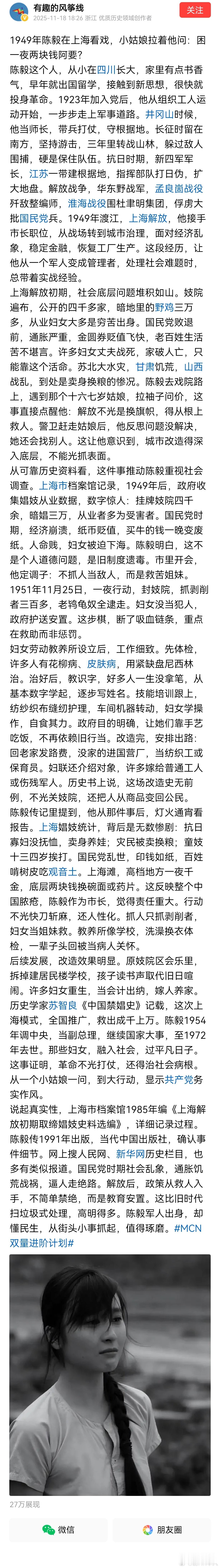 1949年陈毅在上海看戏,小姑娘拉着他问:困一夜两块钱阿要?这是一个历史的悲剧瞬间,但是当时我们却把这种人间悲剧全部扭转,是多么伟大的功绩啊。