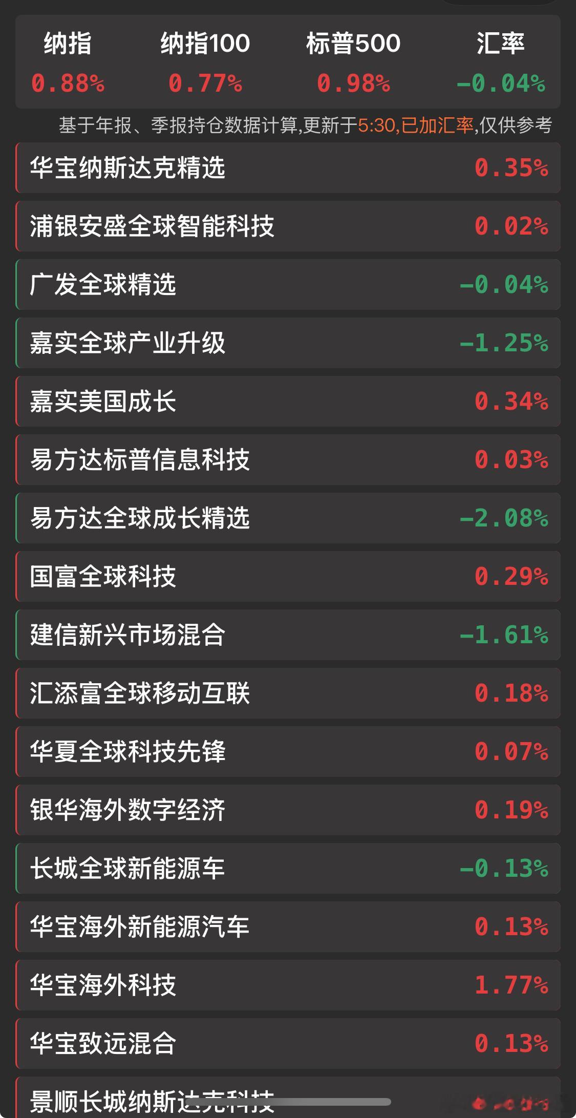 晚安。今天消息面相对平静。给你们回顾一下昨晚美股基金涨幅。