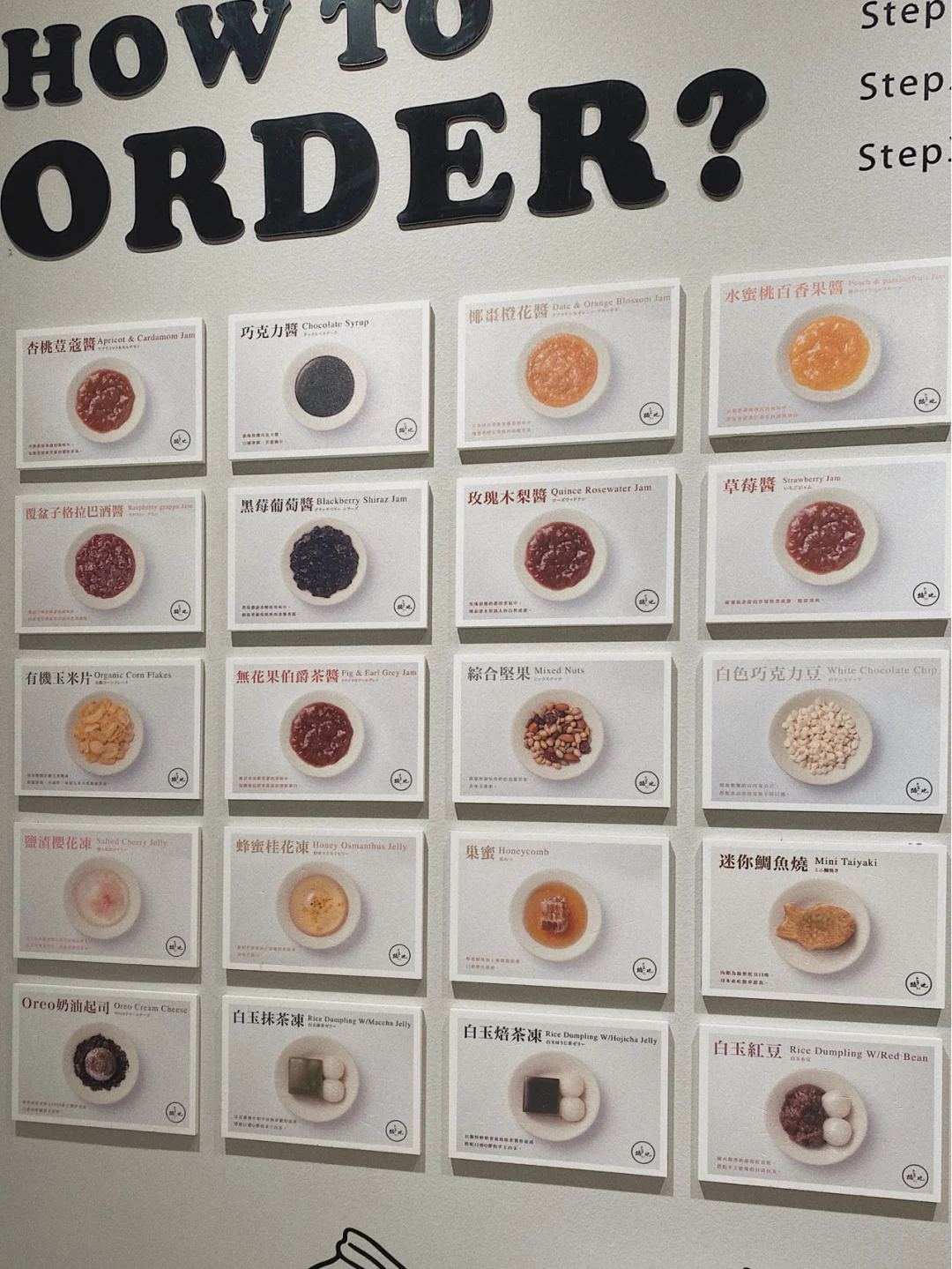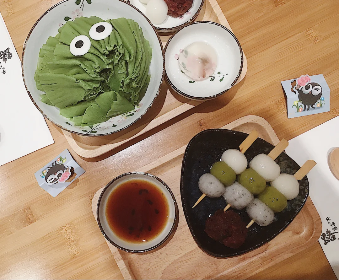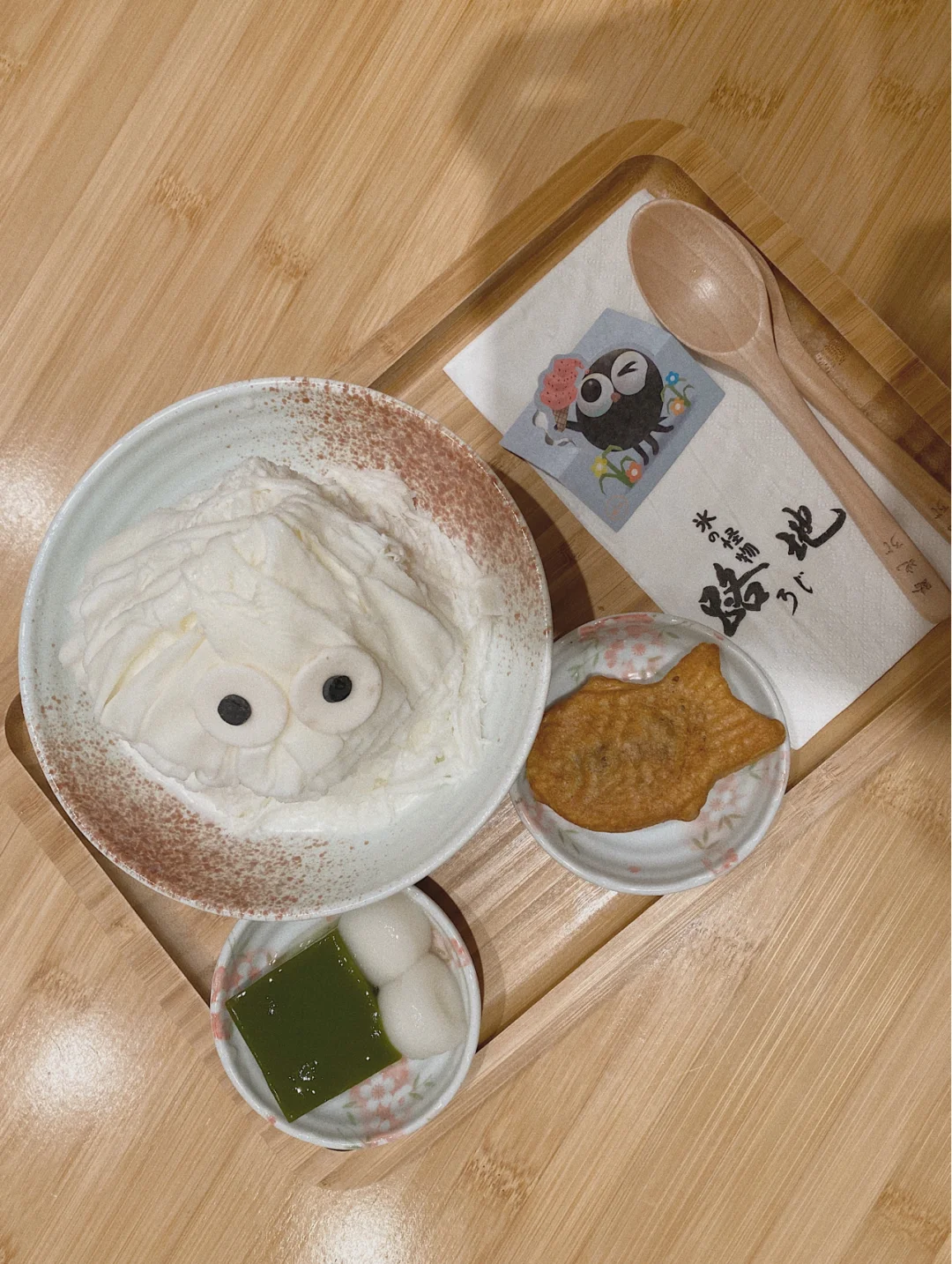 他们是套餐的形式 1⃣️个冰沙搭配2⃣️样小食(比如抹茶冻 鲷鱼烧🐟糯米丸子🍡雨滴樱花冻🌸等) 也有单点的甜品