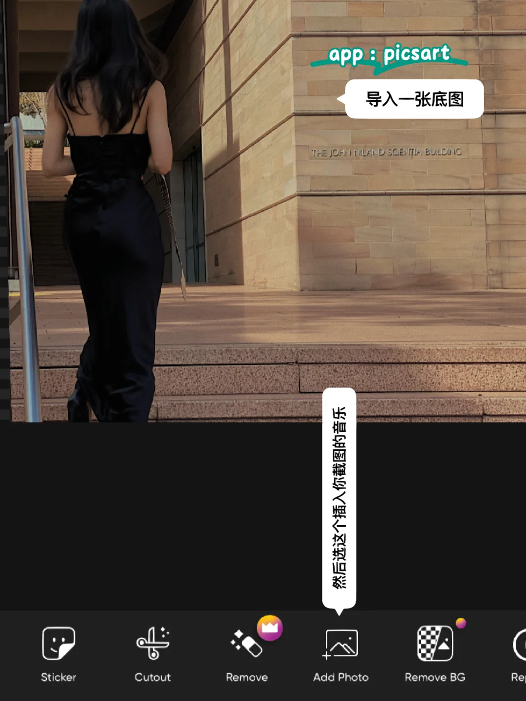 ▫️打开app(picsart)插入底图 选择增加图片 插入音乐截图(图11)