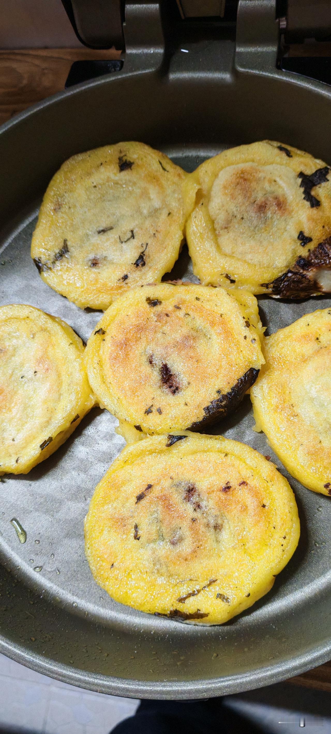 我以为是黑龙江的呢才买,要知道是锦州的,我不会买的。 因为锦州粘豆包不适合我的口味,很难吃。 即然买了则吃之吧。 于是我用电饼铛烙的,看着是不是很有食欲? 实则不然。 再也不会买了。