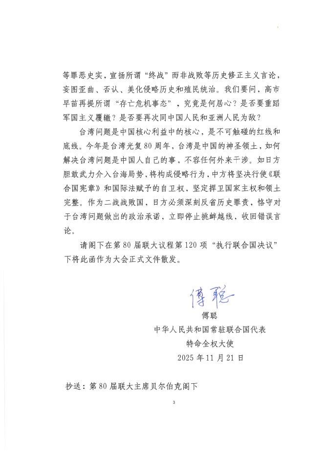 行动“合法化/正当化”,再进一步! 傅大使今天致函联合国秘书长古特雷斯,并要求该函作为联合国大会正式文件向全体会员国散发。 直至今日,高市都没有表现出在议会场合公开收回言前的打算,所以咱们该准备的,要加紧准备: ○ 公布历史/证据档案 → 争取第三国舆论支持或至少减弱反对。 ○ 联合国文件(把信函存档、作为正式大会文件)→ 给未来行动做“纸面合法性”备份。 ○ 事先在国内立法或动员授权上做准备 → 快速动员不易被国内司法阻挡。 ○ 与友国秘密协调或提前打招呼 → 减少直接对抗时的外部干预。 动手之前,程序先走完,等哪天“决心”下了,就能马上行动。 source: X
