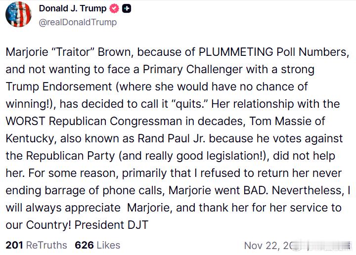 特朗普总统11月22日:玛乔丽“叛徒”布朗因为民调暴跌,又不想面对一位拥有强力特朗普背书的初选挑战者(在那种情况下她根本没有胜算!),已经决定“退出”了。她与几十年来最差的共和党国会议员、肯塔基州的汤姆·马西(因为总是投票反对共和党和真正好的立法,被称为“兰德·保罗二世”)的关系,也没有帮到她。不知为何,主要原因可能是我拒绝回她那铺天盖地、没完没了的电话,玛乔丽“变坏”了。尽管如此,我仍然会感激玛乔丽,并感谢她为我国所做的服务!