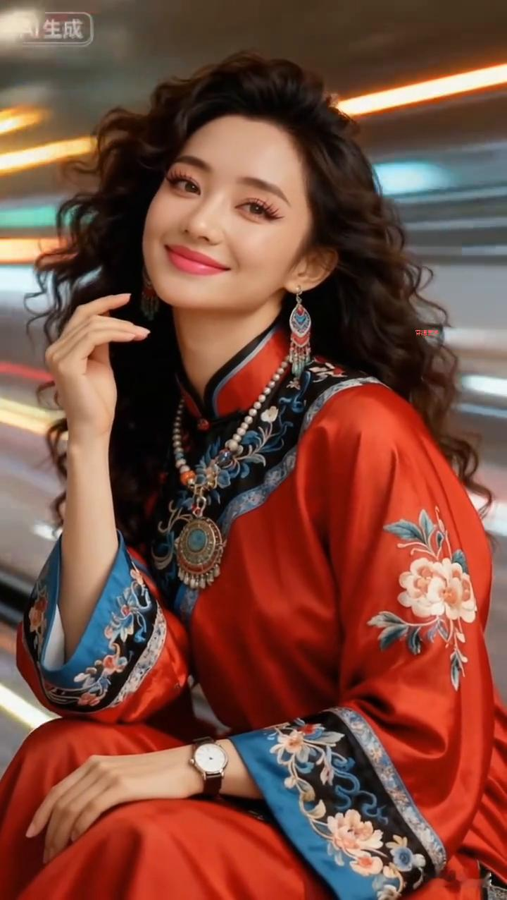 红袍的光泽裹着刺绣的温柔,卷发漫过耳畔的银铃响,风里有烟火的暖,眼里藏着不慌不忙的甜。这是属于我的热烈又柔软的时刻。