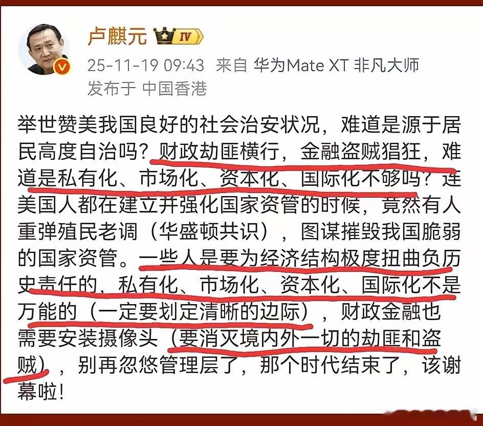 知名学者卢麒元社交平台发声,直指财税领域掠夺乱象与金融系统失序问题,批评部分势力借“市场化”之名瓦解国家资管根基,重拾殖民旧论、迷信“华盛顿共识”。他强调私有化非万能灵药,市场化、资本化需设红线与边界,呼吁财政金融体系全面引入监督机制,清除各类经济劫掠行为,警告企图蒙蔽决策层的势力“忽悠时代已终结”。此番犀利发声引发广泛共鸣,金融圈紧急反应,相关讨论已成新一轮思想交锋。你是否认同“经济治理需守底线”的观点?