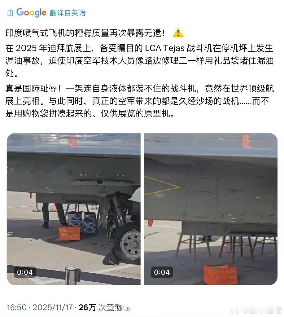 迪拜航展印度光辉战机机毁人亡,印度大国梦碎。当地时间11月21日,2025年迪拜航展的最后一天,本应是印度国产“光辉”战机彰显实力的高光时刻,却演变成了一场震惊全球的悲剧。下午2点10分许,这架承载着印度航空工业希望的战机,在完成特技翻滚动作后突然失控,低空俯冲坠毁并燃起熊熊大火,黑色烟柱直冲云霄,现场目击者形容“腾起巨大蘑菇云” 。飞行员未能弹射跳伞,当场遇难。而尴尬的是,航展首日,另一架参展的“光辉”战机就因机身滴落液体引发热议,现场地勤人员用简易容器承接的画面被疯传,“漏油”标签迅速刷屏社交媒体 。尽管印度官方紧急辩解这是“环境控制系统的冷凝水”,但这种苍白的解释难以打消外界疑虑。最终,两架参展战机一台陷“漏油疑云”,一台坠毁人亡,在全球航空业面前上演了一出双重丢脸的闹剧,让印度精心营造的“国产骄傲”形象瞬间崩塌。1、印度军事大国梦,已经在5月7日印巴冲突印度空战惨败而破灭。印度一直以军事大国自居,但历史与现实早已反复戳破这份虚幻。回溯5月7日印巴空战,不到30分钟内击落8架印度战机,整场战争累计击落击伤11架印度战机,印度所谓的空中优势沦为笑柄。地面战场上,巴基斯坦陆军的猛烈炮击更让印军节节败退,抱头鼠窜,所谓的“军事强国”形象在实战中彻底破产。2、制造大国梦,因为这次航展一架漏油和一架坠毁双重翻车,印度制造再贴劣质标签。莫迪政府力推的印度制造战略,曾被寄予厚望,而光辉战机正是这一战略的核心名片之意。但此次迪拜航展的连环闹剧,让印度制造的低劣形象再次被钉在耻辱柱上。一架战机在静态展示时就出现疑似漏油的低级问题,另一架在关键的飞行表演中直接坠毁,这种“出厂即故障”的表现,不仅让潜在国际客户望而却步,更暴露了印度航空工业在设计、制造、品控等全链条的缺陷。事实上,光辉战机的不靠谱早有先例。此前该机型就因超重问题被印度海军直接拒绝采纳,如今在国际舞台上的公开失利,更是给“印度制造”的出口前景蒙上阴影。光辉战机去年境内演习就曾发生坠毁事故,如今国际航展上再酿惨剧;发动机交付严重滞后,99台订单仅完成4台交付,连本国空军的装备更新都难以保障。3、政治大国梦,关税战站队失误还被美国施压屈服,印度这次打脸很重。军事与制造的短板之外,印度的政治大国梦同样遭遇重创。中美关税战,印度选择了站队美国,为美国人的无耻行为洗地。结果一样被特朗普关税战列入重税。俄乌冲突爆发后,印度试图在美俄之间左右逢源,一边大量采购俄罗斯低价石油,一边寻求美国的战略支持。结果美国直接对印度加征高额关税,施压其停止购买俄油 。丢人的是,面对压力,印度最终选择妥协,承诺暂停采购俄罗斯石油,试图向美国示好。然而戏剧性的是,就在印度做出妥协后,美俄却达成协议,推动乌克兰接受相关合约,印度的“战略站队”瞬间沦为无用功。既没能保住与俄罗斯的能源合作,也没能换来美国的真正信任,反而因判断失误在大国博弈中颜面尽失。这种缺乏战略定力、被他国牵着鼻子走的表现,暴露了印度作为“政治大国”的短板——既没有足够的实力支撑独立自主的外交,也没有精准的判断力规避风险,所谓的“政治大国”梦,终究只是镜花水月。国际地位,从来不是靠吹牛的,没有过硬的技术、可靠的制造和清醒的战略,再宏大的大国叙事,最终也只能沦为国际舞台上的悲情闹剧。莫迪的大国梦,终究碎在了实力不济的残酷现实里。