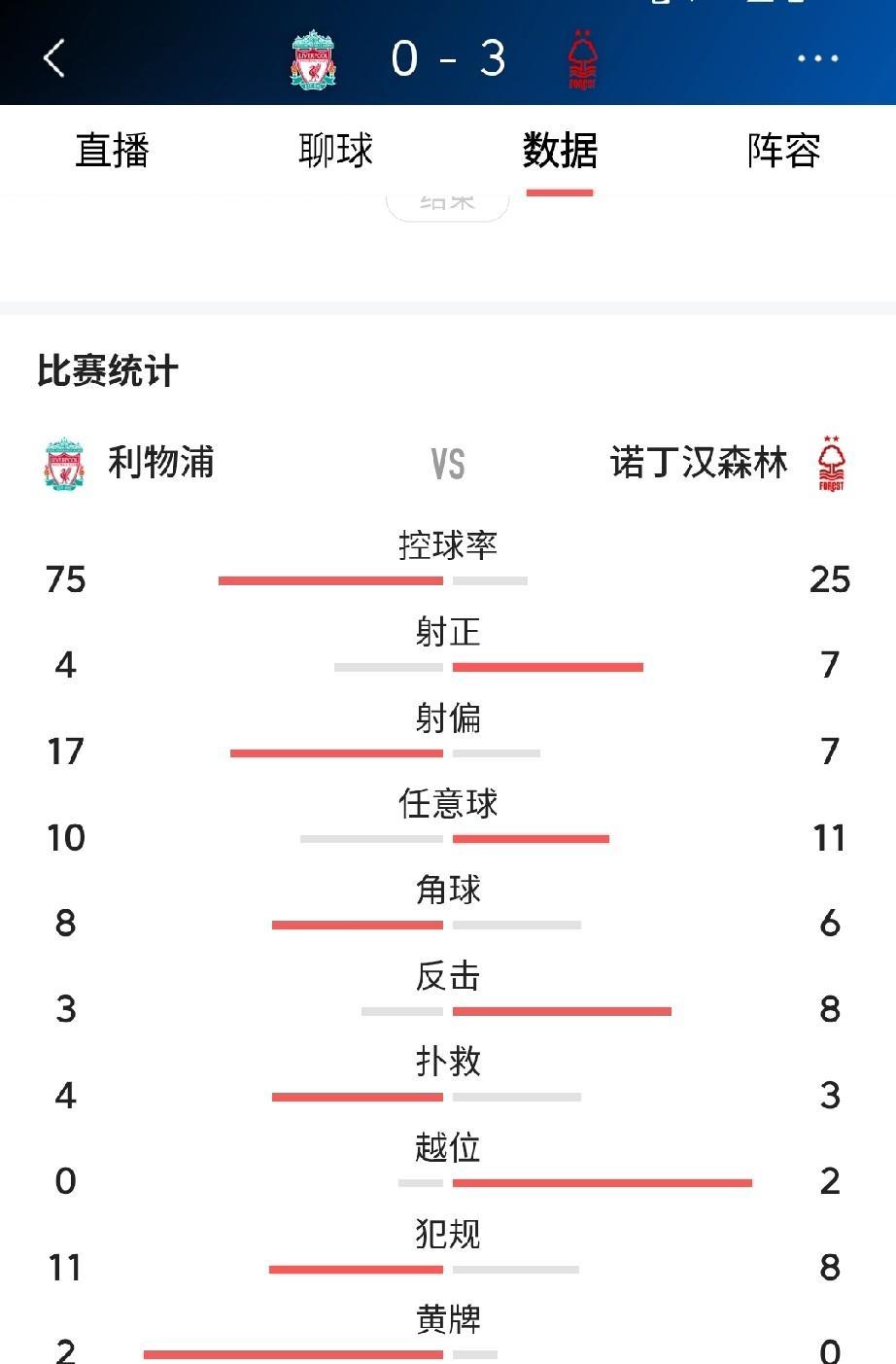 利物浦彻底懵逼了,几乎全主力阵容,除了伊萨克和科尔凯兹都是上赛季原班人马,结果主场0-3爆冷倒在诺丁汉森林脚下。结合利物浦近期战绩,似乎也不能用爆冷二字。诺丁汉森林已经不是上赛季的疯狂诺丁汉,这赛季情况非常不好,这场比赛之前联赛2胜3平6负,仅积9分排名倒数第二。就这么一个送分童子能赢利物浦个3-0。利物浦的防守有多糟糕,可见一斑。利物浦全场被诺丁汉射正7次进3球,而自己仅有3次射正无一收获,空有75%的控球率,没有卵用。