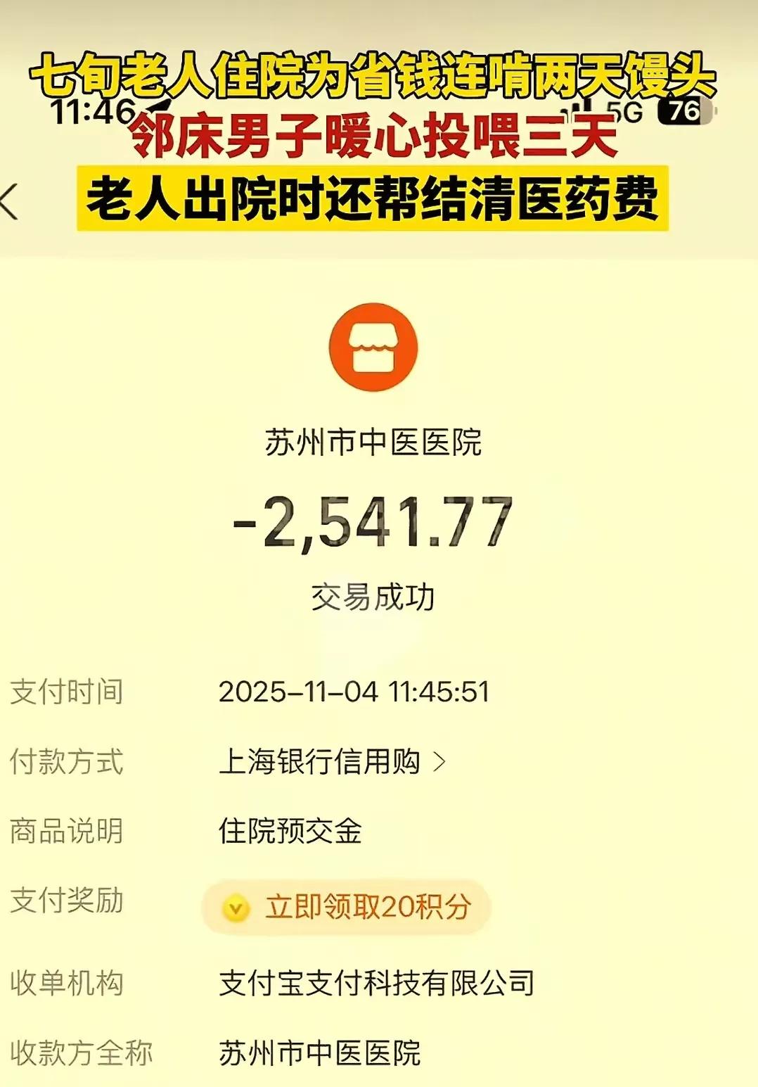 苏州这波操作太炸了!住院小伙的举动,让全网直呼暖心到破防! 七旬老人住院没人照料,连续两天就啃干馒头,嚼得腮帮子都使劲,连口热汤都没有。 医生查房问起饮食,老人叹着气说家里没钱,能顶饿就行。旁边同住院的小伙听了,转头就多订了份外卖,笑着跟老人说“送错了一份,扔了可惜,您帮着吃点”。 接下来三天,小伙天天都“多送”一份外卖,老人从推辞到吃得喷香,看得出来是真饿坏了。 谁能想到!老人出院结账时,直接被护士告知医药费早结清了——竟是小伙默默给缴的!老人当场攥着小伙的手红了眼,连说好几声谢谢。 善良从不是空话,这小伙用实打实的行动暖透人心,这才是人间该有的温度! 苏州暖心瞬间 人间自有真情在
