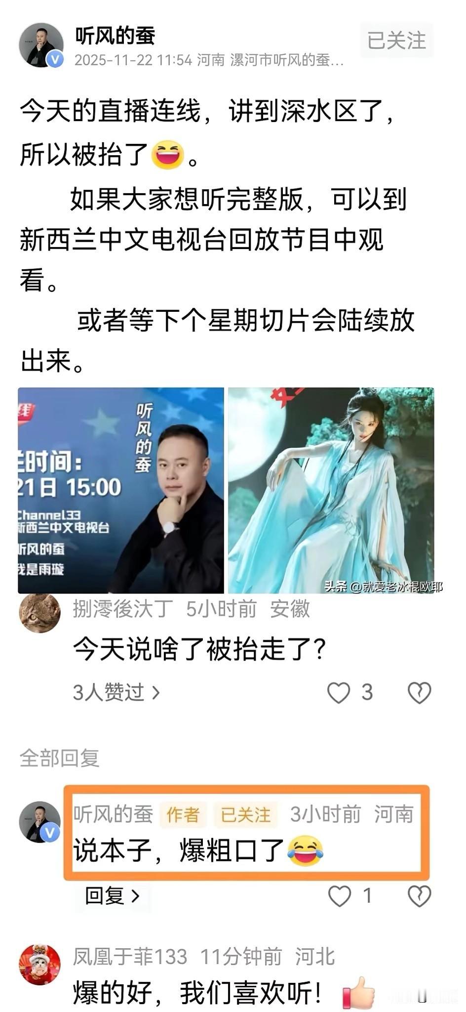 谁能想到听风的蚕连海外直播都能被“抬”?这波操作真的又意外又好笑[呲牙]据老蚕自己爆料, 和新西兰中文电视台连线时,因为口无遮拦提了不该提的,还带了点情绪爆粗,直接被当场中断,网友笑称“海外版翻车现场”。 其实老蚕和这家电视台早有合作,节目还能在蜻蜓FM、网易云音乐搜到往期内容,不过这家2006年就成立的华人电视台,主要靠当地Freeview网络播放,国内观众想蹲直播确实不容易,难怪大家只能靠“切片”解馋。 你们蹲到过老蚕的完整直播吗?国内还有啥渠道能看新西兰中文台的节目?