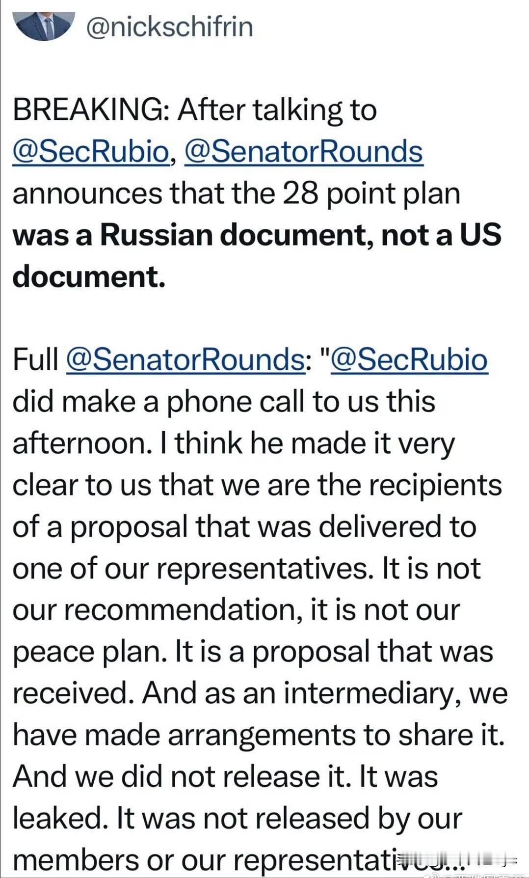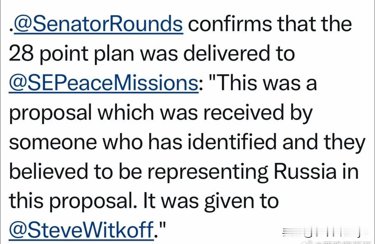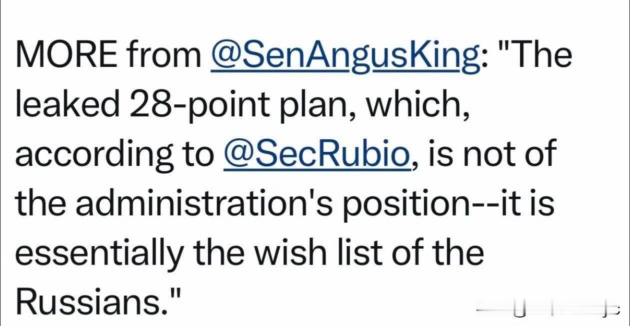 彭博社报道:共和党联邦参议员与国务卿卢比奥对话后,得到确认——“28条”是俄方文件、并非美国起草。 他解释说,这份文件,是俄的“愿望清单”,不是“美方立场”,由俄方代表交给美国总统特使Witkoff。 美国没有正式公布文件,是有人故意泄露的。 据Rubio:美国没有威胁停止提供情报或武器,不知是哪里传出的信息。 按照卢比奥的说辞,美国没参与“28条”的起草,显然不能自圆其说。 一,“28条”确实存在,但俄罗斯表示没有看到正式文本,既然是俄罗斯起草他们怎么会看不到? 二,欧盟已经了解了“28条”的全部内容,并提出不同意见。表示不接受没有参加与的关于俄乌战争的任何文件条款。 三,乌克兰泽连斯基表示,目前是我们历史上最困难的时期之一,乌克兰面临非常艰难的抉择,要么丧失尊严、要么失去关键伙伴…要么接受28条、要么经历严冬。泽连斯基直接点出“28”条,难道是俄罗斯送给他的吗? 四,即使“28”条是俄罗斯一手炮制的,白宫是怎么得到的?即使俄送达到美国特使,但这样一个重要文件怎么可能轻易泄露出去?且美高官已经说明此文件是与俄罗斯共同商定的。 五,特朗普已经喊话泽连斯基,4天以内,必须给出明确答复。 综上分析,卢比奥的言论显然站不住脚,那么他在此时发布这样的言论又是什么意思?或许美国态度有变? 或者另有深意?