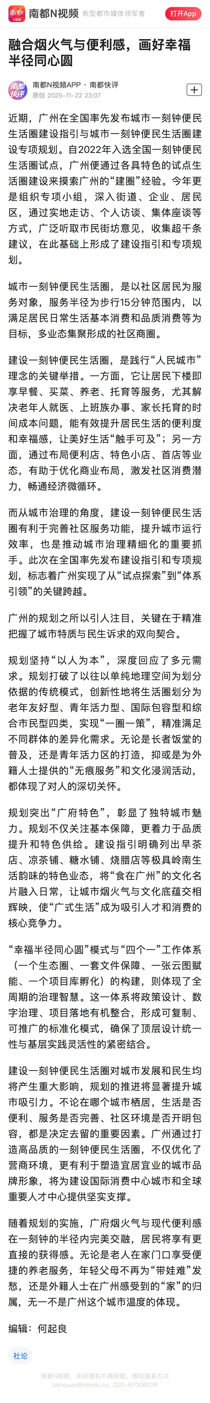 【南都快评:融合烟火气与便利感,画好幸福半径同心圆】近期,广州在全国率先发布城市