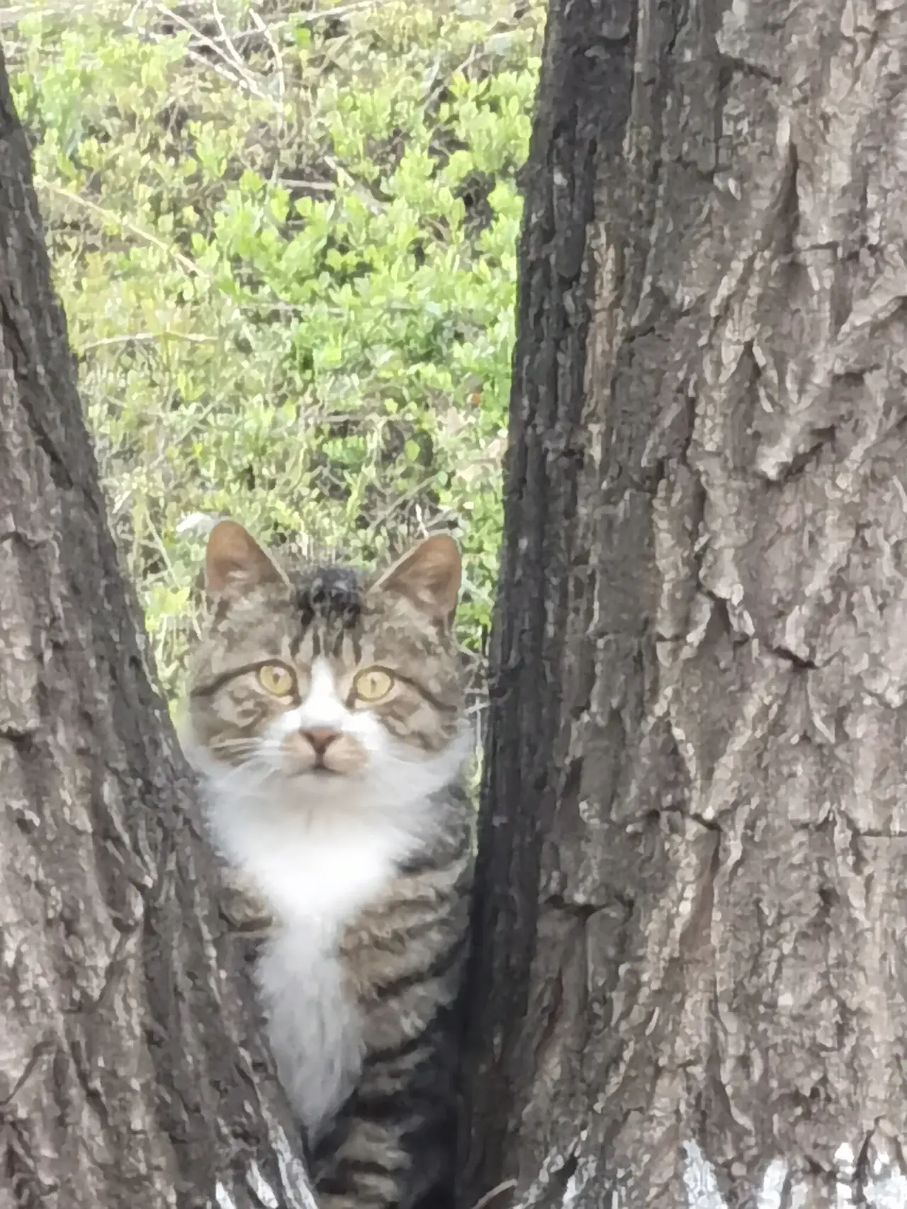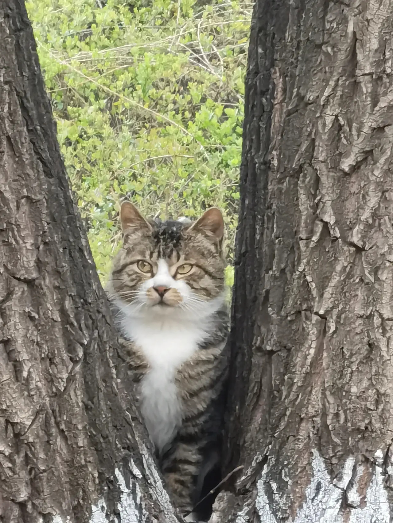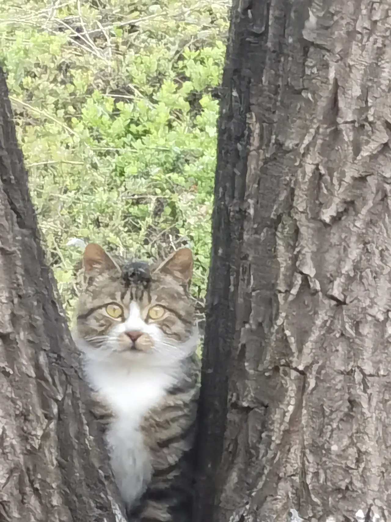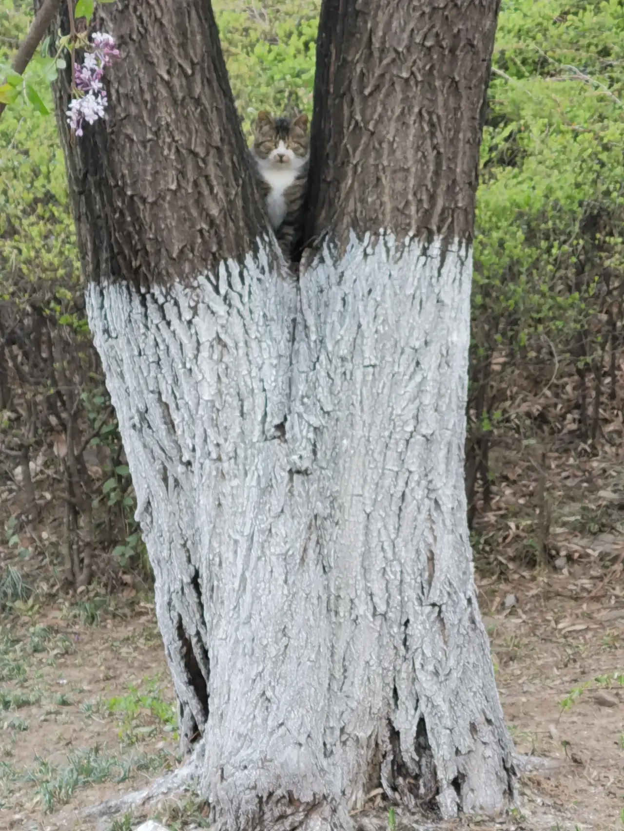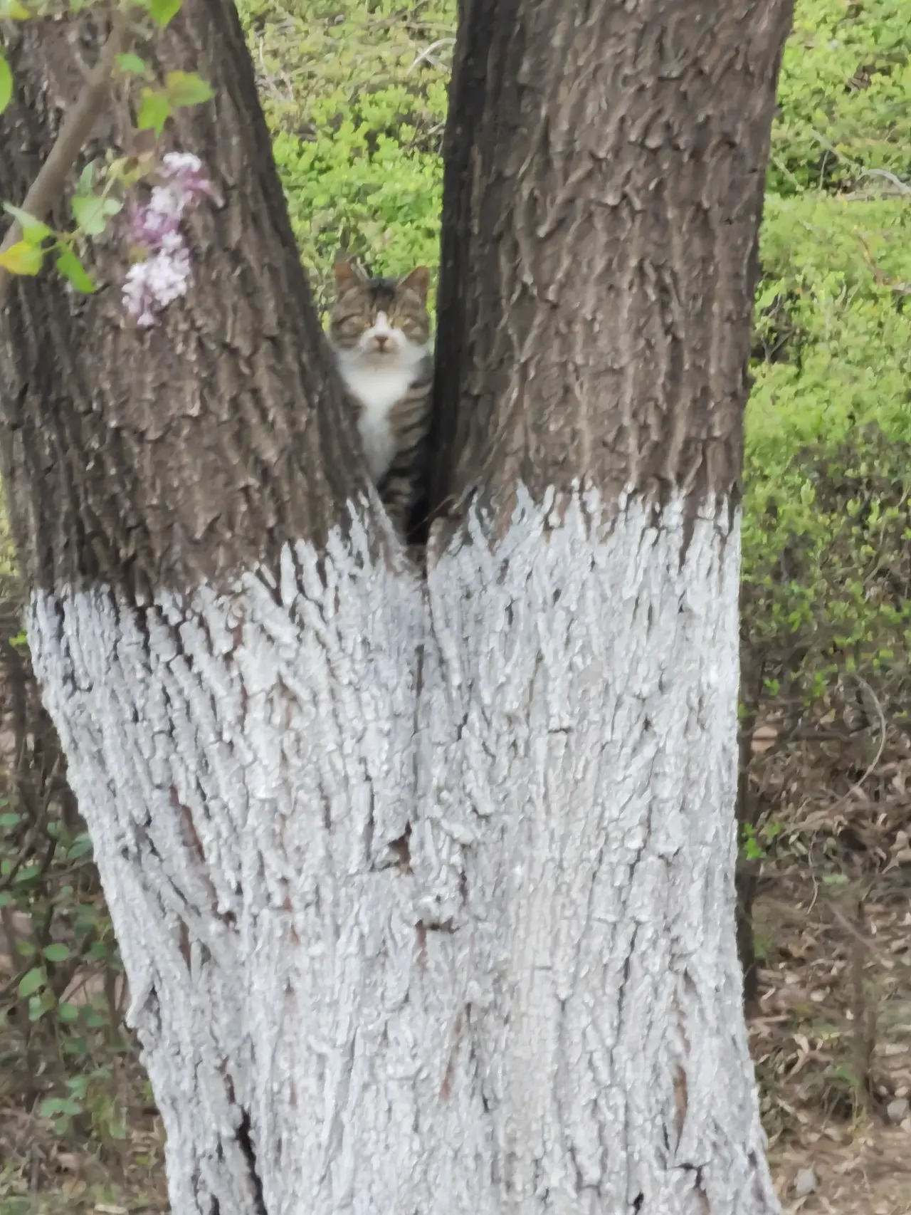 每天下午五点左右,河边那个钓鱼的人会收起鱼竿准备回家。一直狸花猫会在这个时间准时出现在“瞭望塔”上——一棵大树的树杈中间,观察对面河边钓鱼者何时离开。一旦钓鱼者离开,狸花猫立刻跑过去吃钓鱼者扔掉的小鱼。日复一日,这只狸花猫就靠这个钓鱼者生存着。狸花猫胖乎乎的,长得非常漂亮,它的警惕性很高,不容易接近,我每次走到那边都会在树杈下面放两根火腿肠,也是怕猫咪挨饿,多么可爱的猫咪呀!