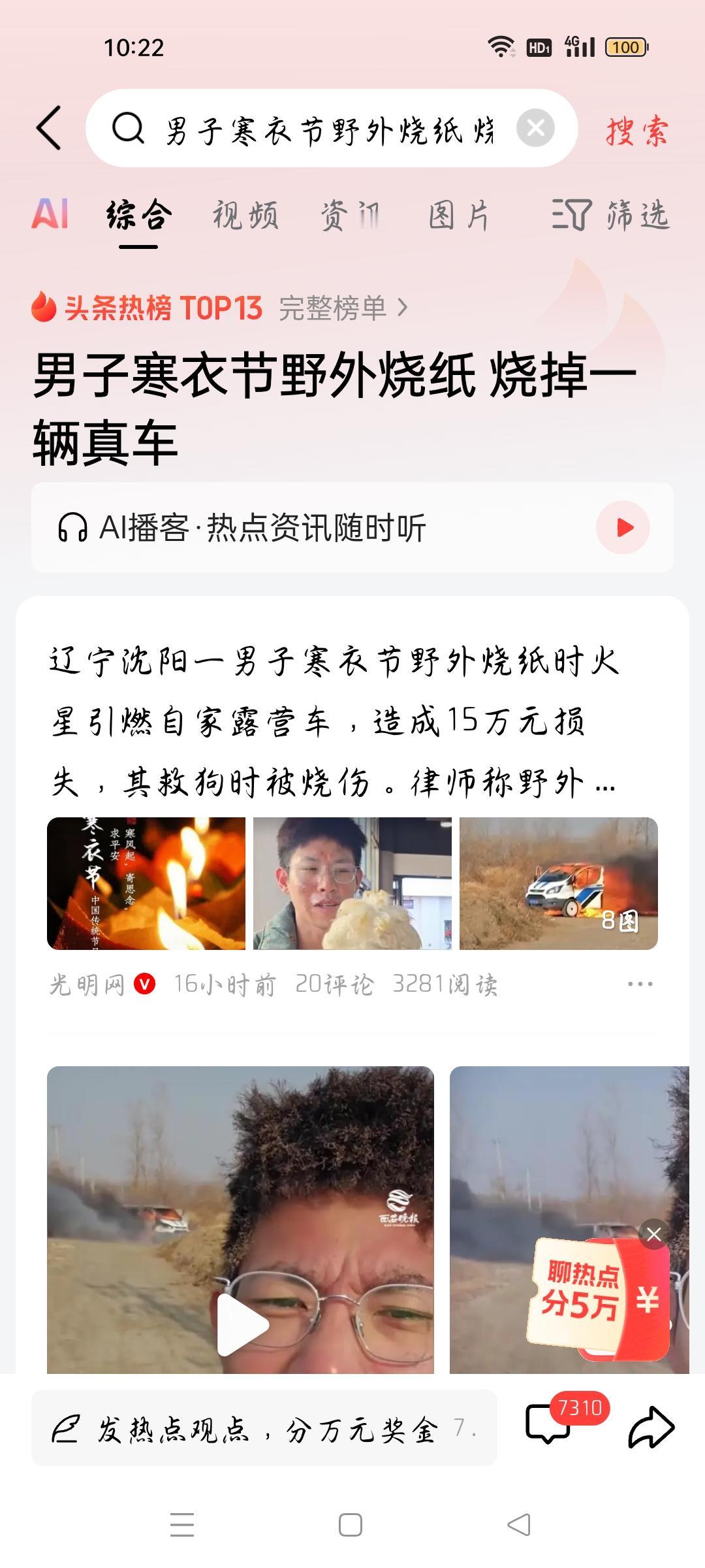 男子寒衣节野外烧纸烧掉一辆真车,我想说 据光明网报道,辽宁沈阳一男子寒衣节野火烧纸时火星引燃自家露营车,造成15万元损失,其救狗时被烧伤,总损失约20万元,我想说,野外烧纸应该远离车辆,尤其是现在干燥有风的情况下,有人问,像他这种情况,烧了自家车,要负法律责任,个人认为,公安机关肯定处罚他。我也是服了这位男子,买个车居然不交保险,现在自担损失,还有救狗受伤,说明狗在他心目中很重要。还有他拍照拍视频,莫非要搏取流量,还是真的大气?唉,野外烧纸安全第一,各位条友觉得呢?
