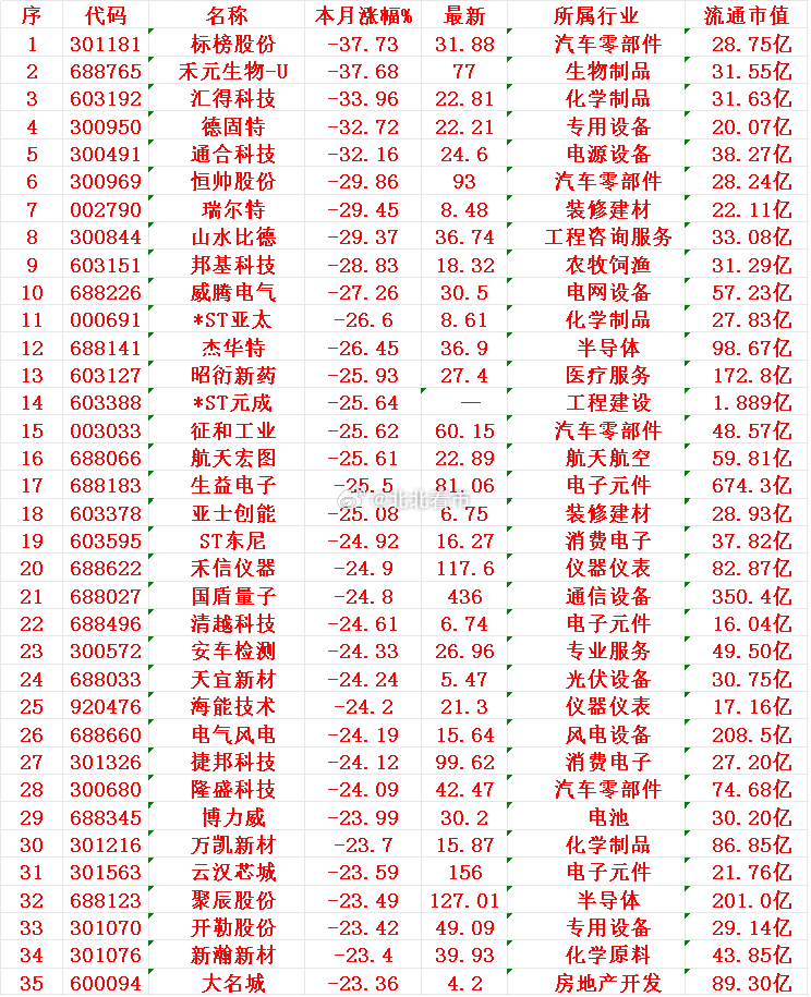 十一月以来,整个市场“跌幅最大”的35名单标榜股份:本月涨幅 -37.73%,流通市值 28.75亿元禾元生物-U:本月涨幅 -37.68%,流通市值 31.55亿元汇得科技:本月涨幅 -33.96%,流通市值 31.63亿元德固特:本月涨幅 -32.72%,流通市值 20.07亿元通合科技:本月涨幅 -32.16%,流通市值 38.27亿元恒帅股份:本月涨幅 -29.86%,流通市值 28.24亿元瑞尔特:本月涨幅 -29.45%,流通市值 22.11亿元山水比德:本月涨幅 -29.37%,流通市值 33.08亿元邦基科技:本月涨幅 -28.83%,流通市值 31.29亿元威腾电气:本月涨幅 -27.26%,流通市值 57.23亿元