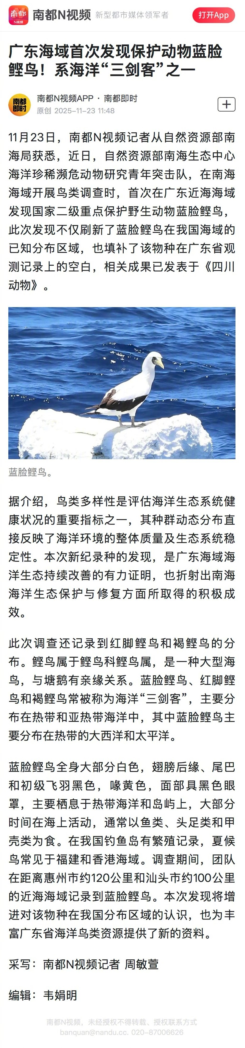 【广东海域首次发现保护动物蓝脸鲣鸟!系海洋“三剑客”之一】南都N视频记者从自然资源部南海局获悉,近日首次在广东近海记录到国家二级保护动物、“海洋三剑客”之一的蓝脸鲣鸟,此次发现刷新了该物种在我国的已知分布区。据悉,蓝脸鲣鸟在我国钓鱼岛有繁殖记录,此次在距离惠州市约120公里和汕头市约100公里的近海海域记录到其身影。此次发现是广东海域海洋生态持续改善的有力证明,也折射出南海海洋生态保护与修复方面所取得的积极成效。南都N视频记者 周敏萱